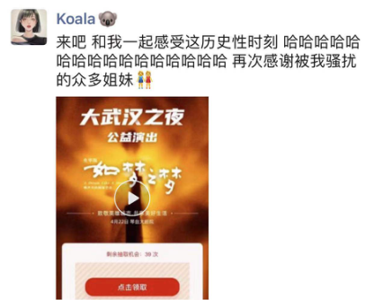 在抽中演出票的幸运儿中,有的一抽即中,有的邀请了100多位好友参加活动,还有网友将抽票经过剪成小视频、制成抽票攻略,发在抖音、朋友圈,广为传播,为大武汉“吆喝”叫好。