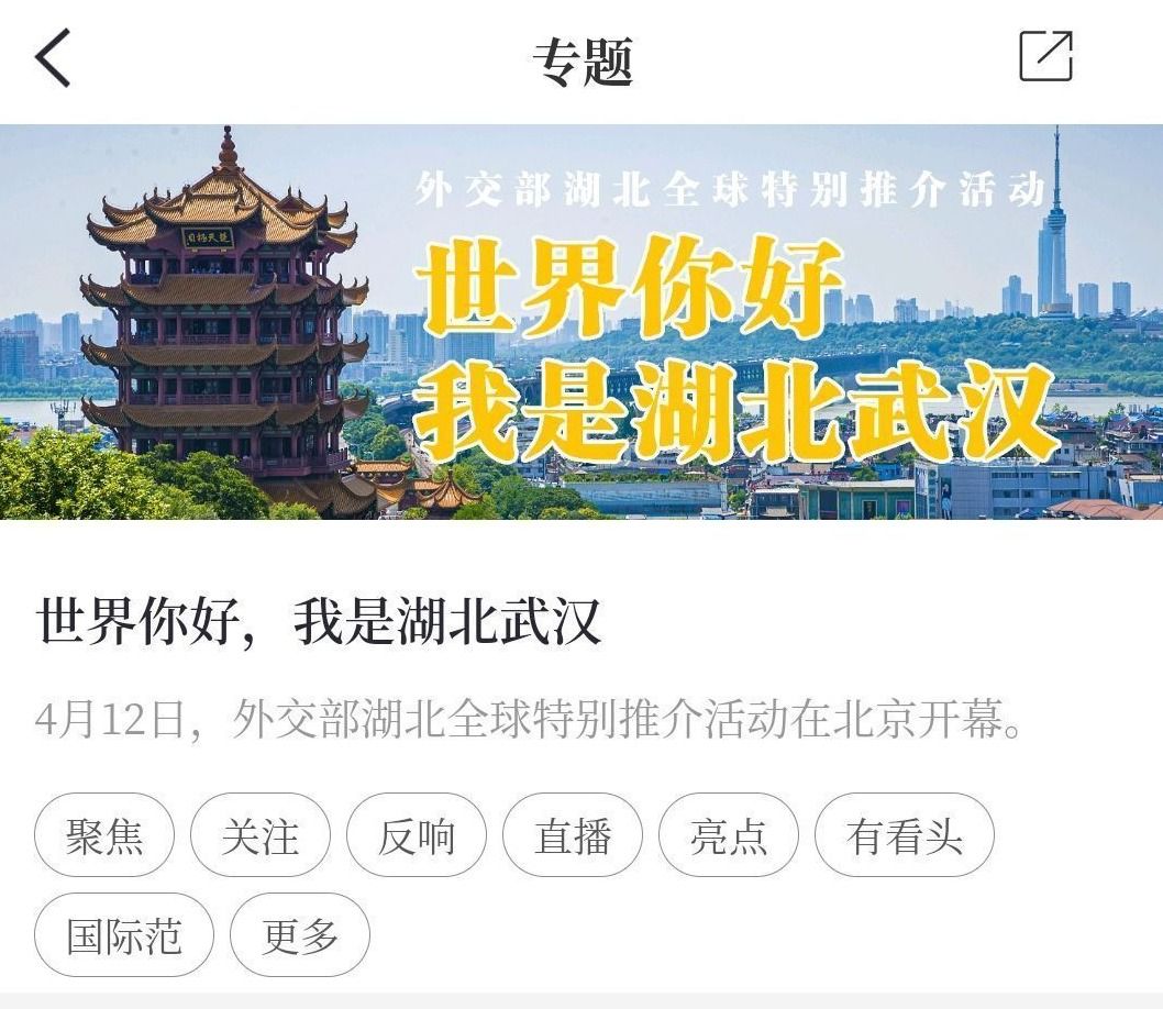 4月12日下午,外交部湖北全球特别推介活动在北京举行。从4月8日开始,“大武汉”客户端就开始预热报道,与长江日报微信、微博、头条号、抖音号、视频号、快手号等多平台联动,向全球推介“大家的武汉”。