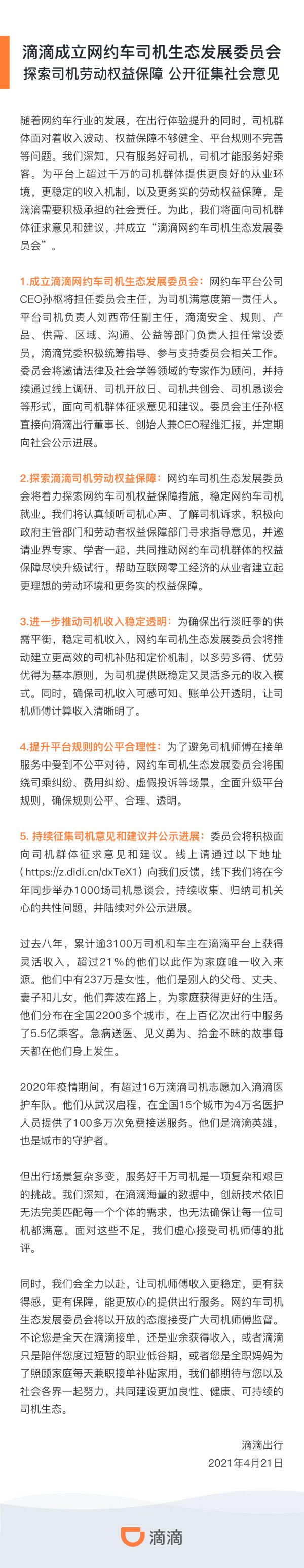 滴滴也会向政府主管部门和劳动者权益保障部门寻求指导意见,推动网约车司机群体的权益保障尽快升级试行。
