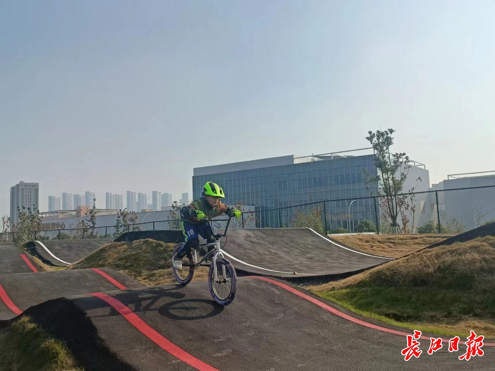 在新建成的轮上运动中心极限泵道场内,几个孩子和年轻人沿着沥青铺成的高低起伏的泵道飞快地骑行着。其中,金银潭小学四年级学生吴禹泽,是一位山地自行车运动爱好者。他说:“我很喜欢骑行,在这里骑车非常炫酷,在坡道上上下下的感觉很刺激。”