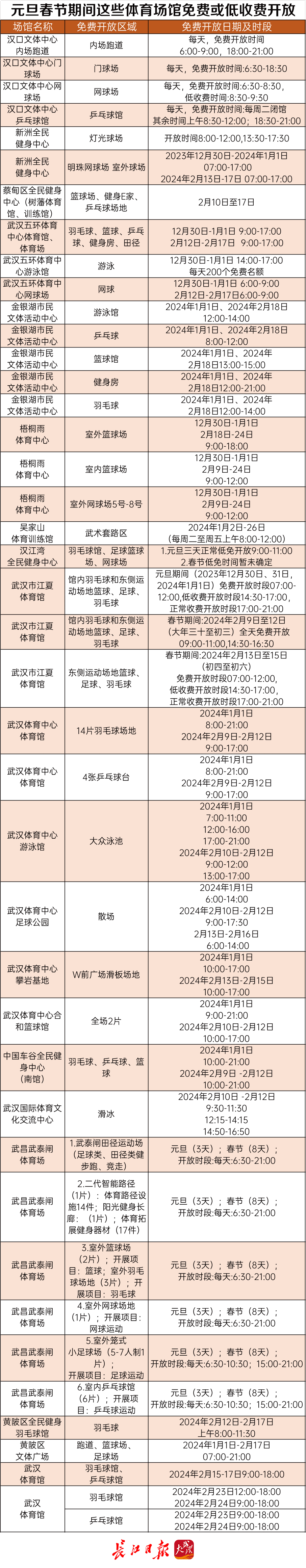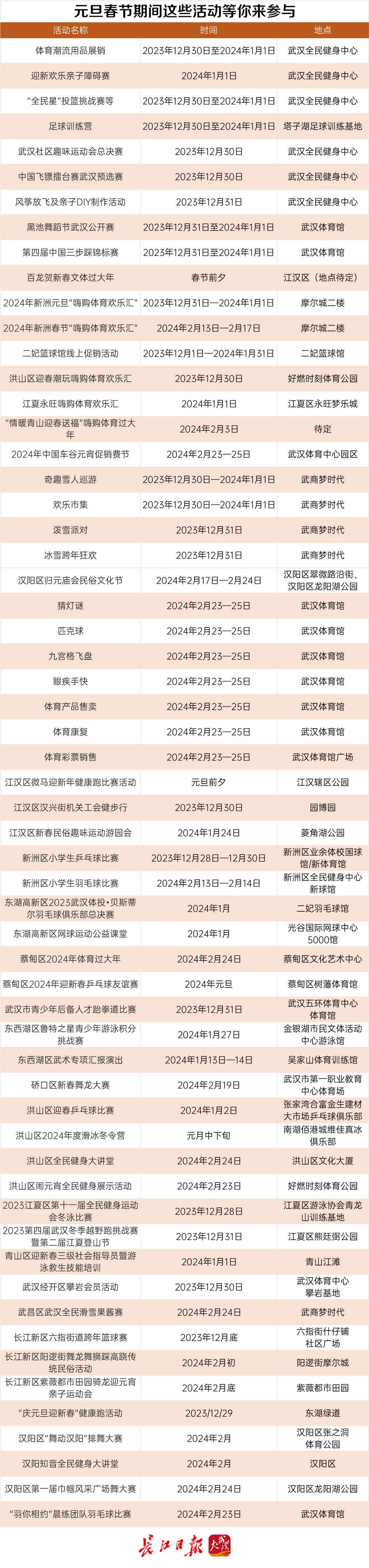 长江日报大武汉客户端12月26日讯(记者张琳)2024年元旦和春节期间,由市体育局精心打造的武汉体育消费秋冬季系列活动之“嗨购体育欢乐汇”暨“体育过大年”,将在全市各城区进行,活动现场将通过举办全民健身竞赛、潮流运动、亲子互动、文体表演、运动服饰“秀场”、网红打卡、国民体质检测、体育场馆免费或低收费开放等形式多样的活动,营造浓厚的节日氛围,丰富市民的节日生活。