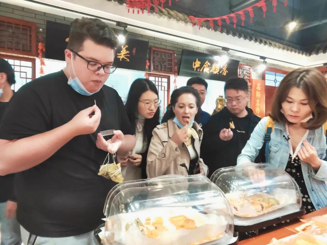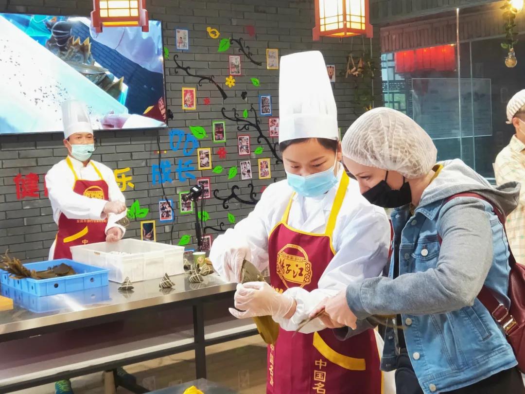 在扬子江非遗文化馆DIY教室,6张桌子分散摆开,外国友人开始学习包粽子。看着扬子江非遗传承人行云流水般的动作,众人直呼“Amazing”。