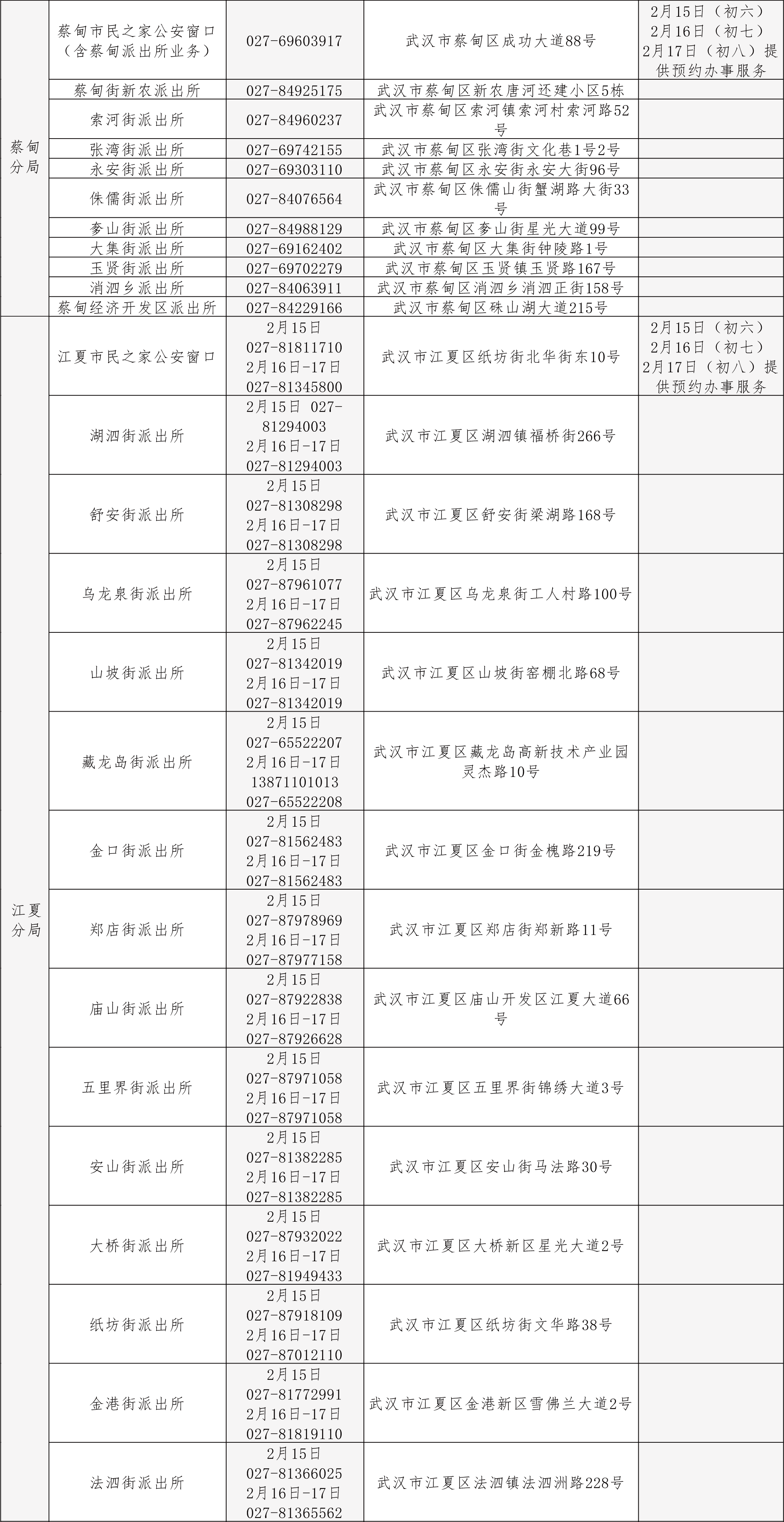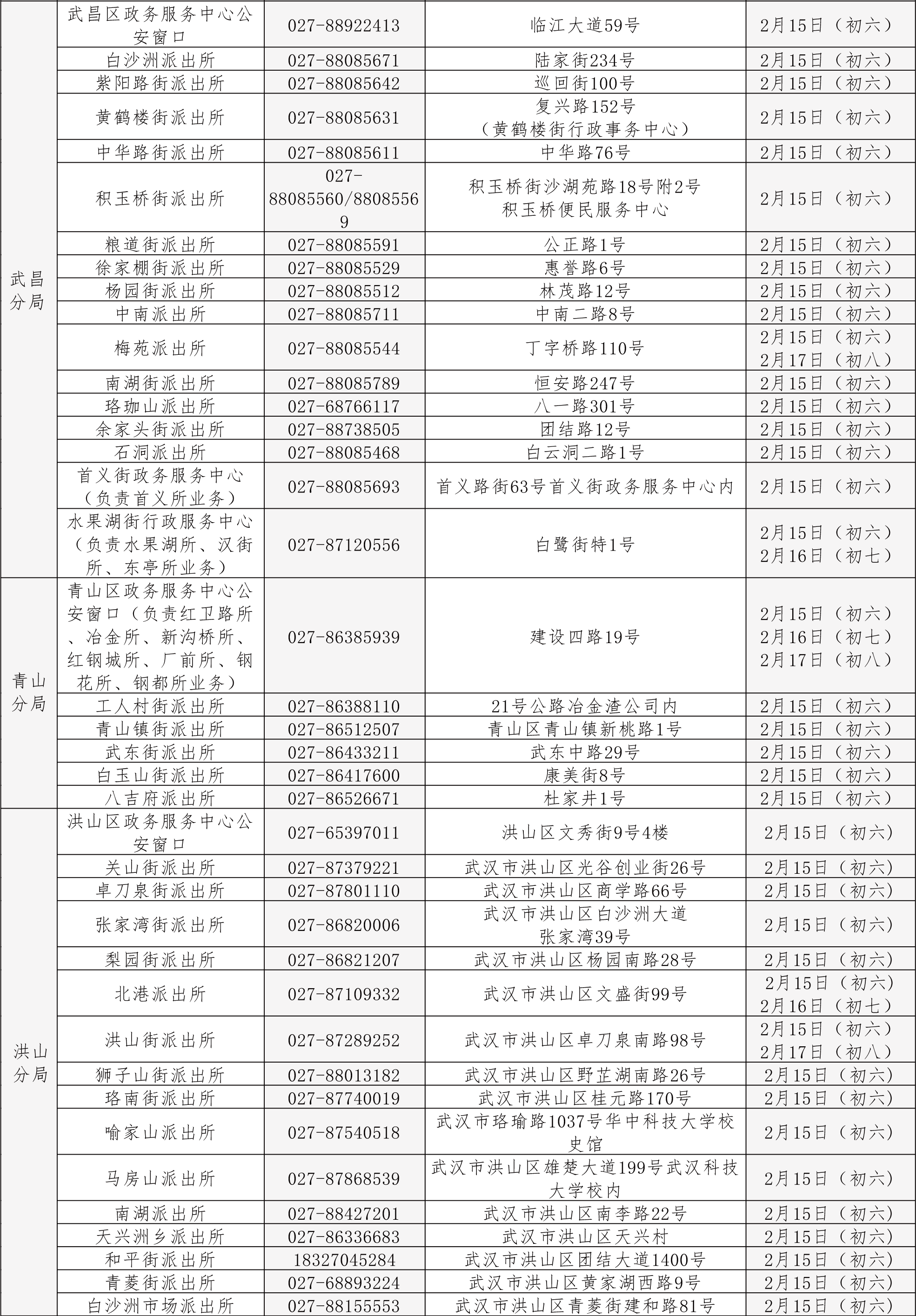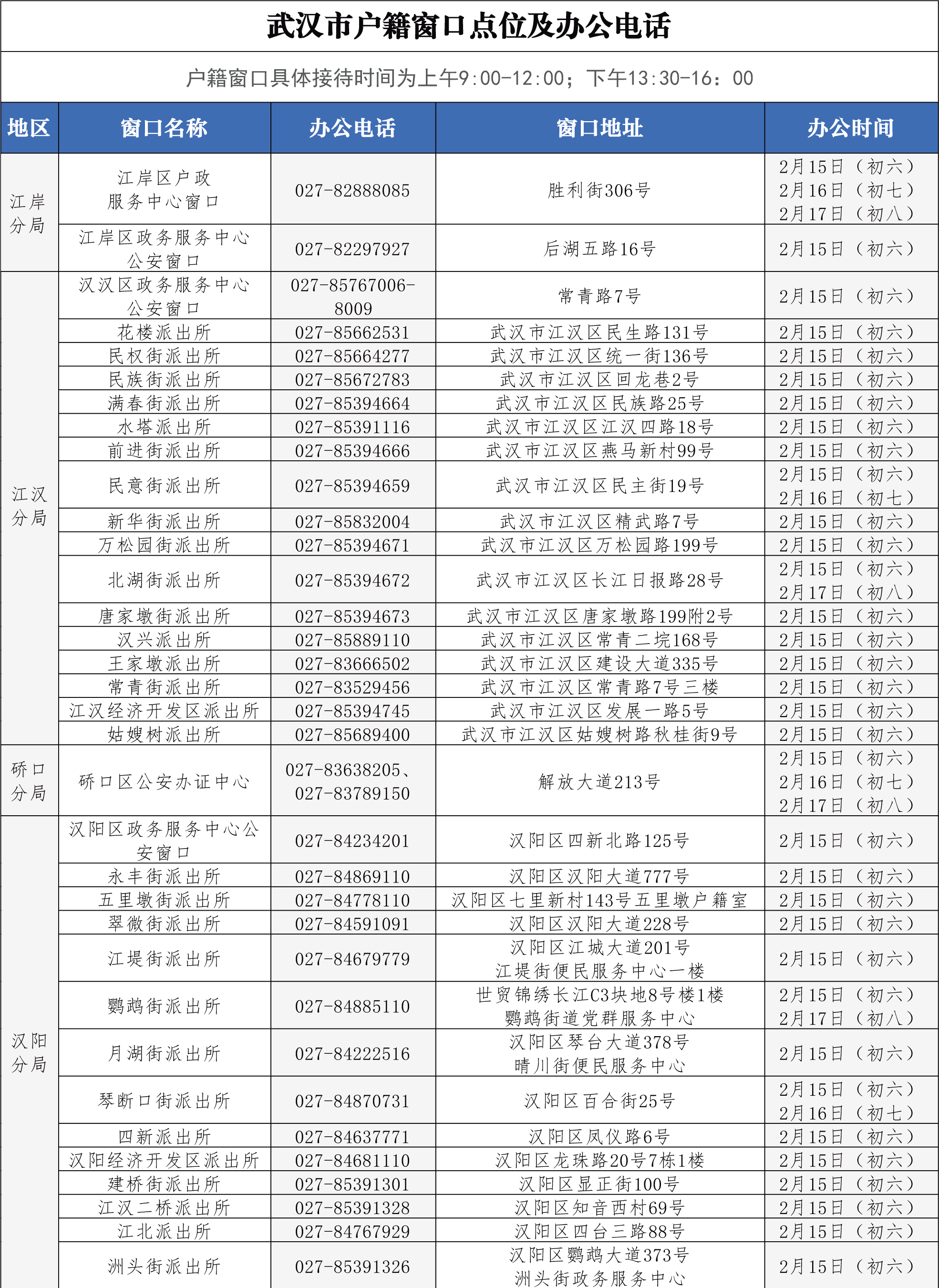 窗口提供延时服务。2月15日(正月初六)9:00—12:00,13:30—16:00,各区政务服务中心公安户籍窗口、各派出所户籍窗口开门办理业务。2月16日(正月初七)、2月17日(正月初八),每日9:00—12:00,13:30—16:00,江岸区、江汉区、硚口区、汉阳区、武昌区、青山区、洪山区、武汉经济技术开发区、武汉东湖新技术开发区、东湖生态旅游风景区公安分局各开放一个户籍窗口提供户籍服务。东西湖区、蔡甸区、江夏区、黄陂区、新洲区、武汉经济技术开发区汉南地区公安分局各户籍窗口提供预约办证办事服务。