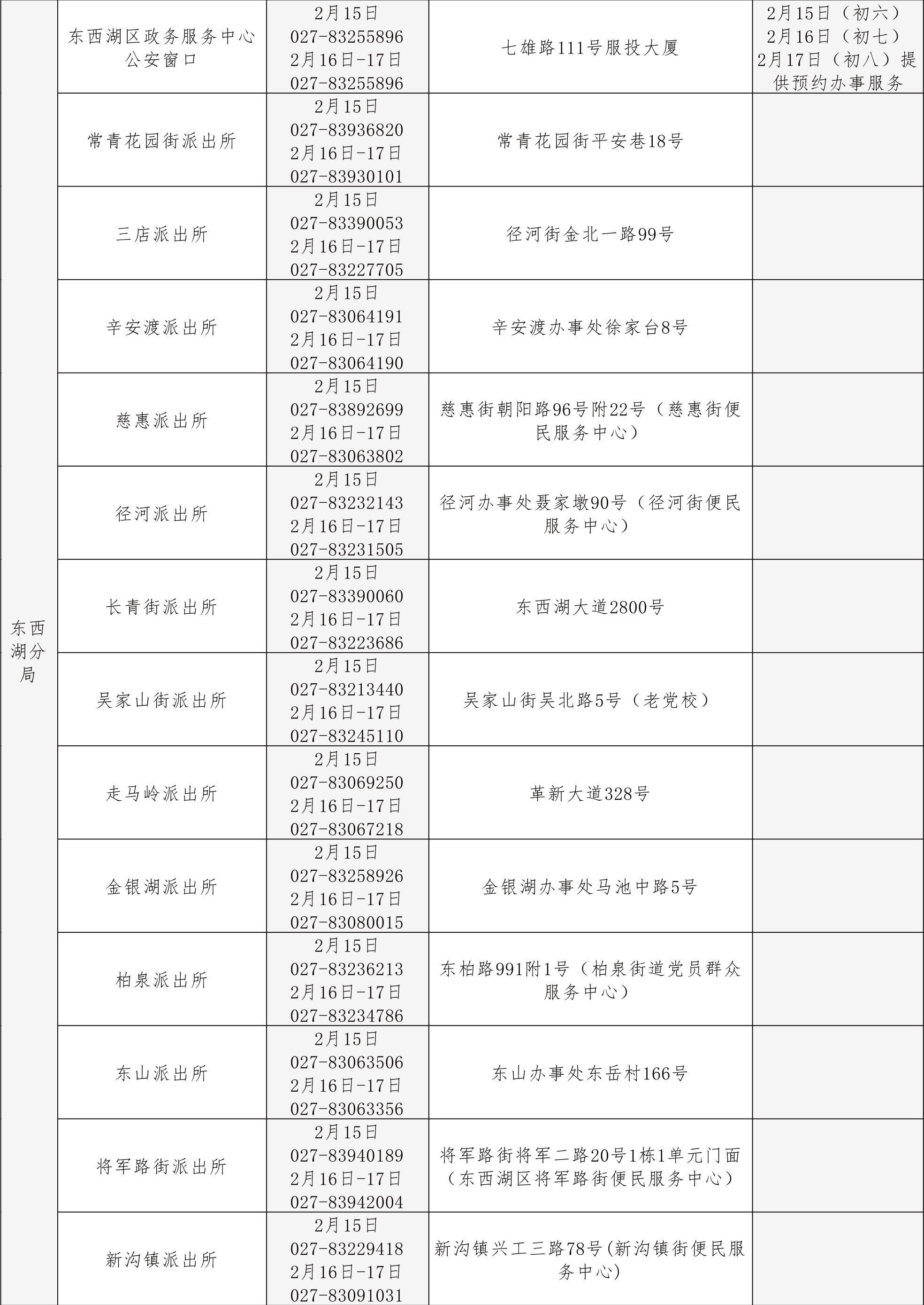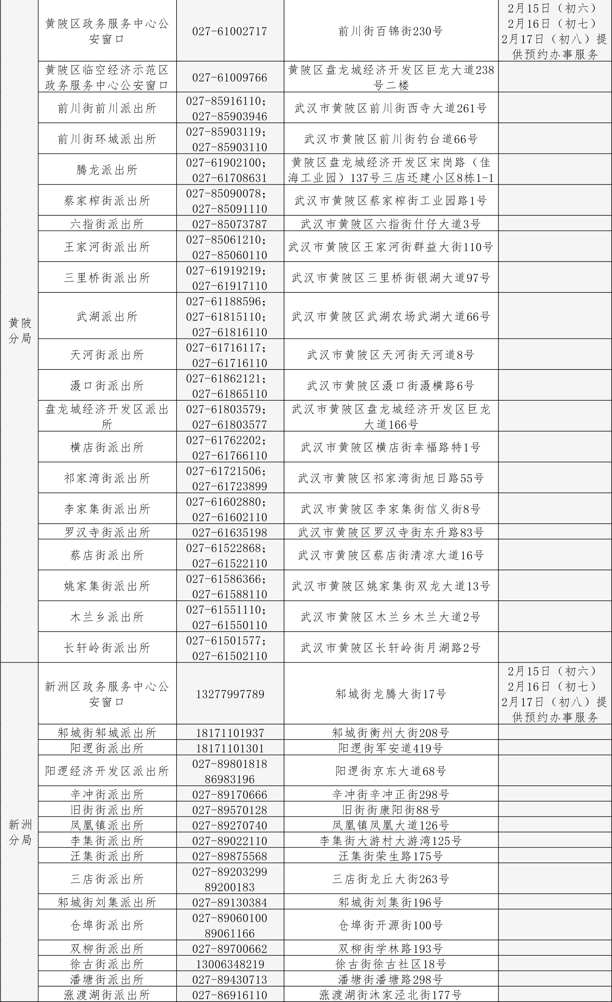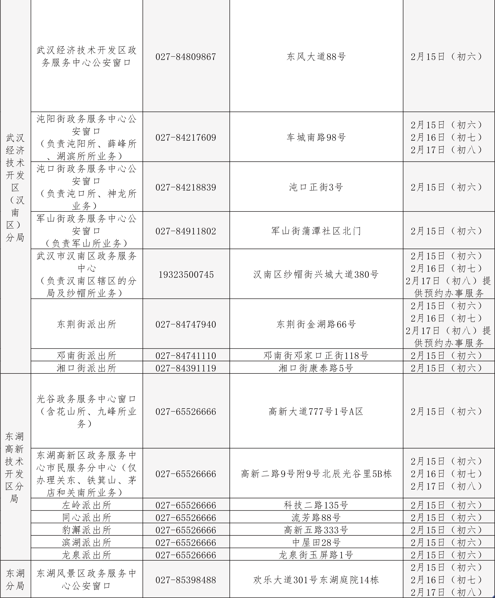 窗口提供延时服务。2月15日(正月初六)9:00—12:00,13:30—16:00,各区政务服务中心公安户籍窗口、各派出所户籍窗口开门办理业务。2月16日(正月初七)、2月17日(正月初八),每日9:00—12:00,13:30—16:00,江岸区、江汉区、硚口区、汉阳区、武昌区、青山区、洪山区、武汉经济技术开发区、武汉东湖新技术开发区、东湖生态旅游风景区公安分局各开放一个户籍窗口提供户籍服务。东西湖区、蔡甸区、江夏区、黄陂区、新洲区、武汉经济技术开发区汉南地区公安分局各户籍窗口提供预约办证办事服务。