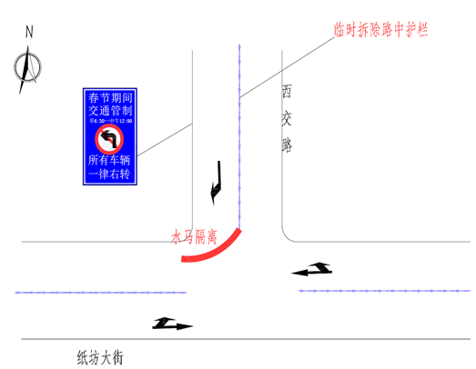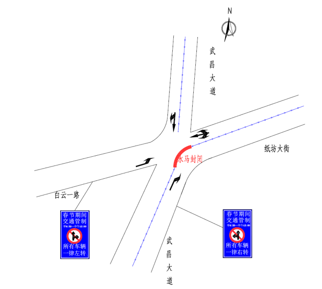 (一)2月10日(初一)至17日(初八),每日9:00至17:00,武昌路民主路口禁止机动车由北向南(民主路往武昌路方向)通行。
