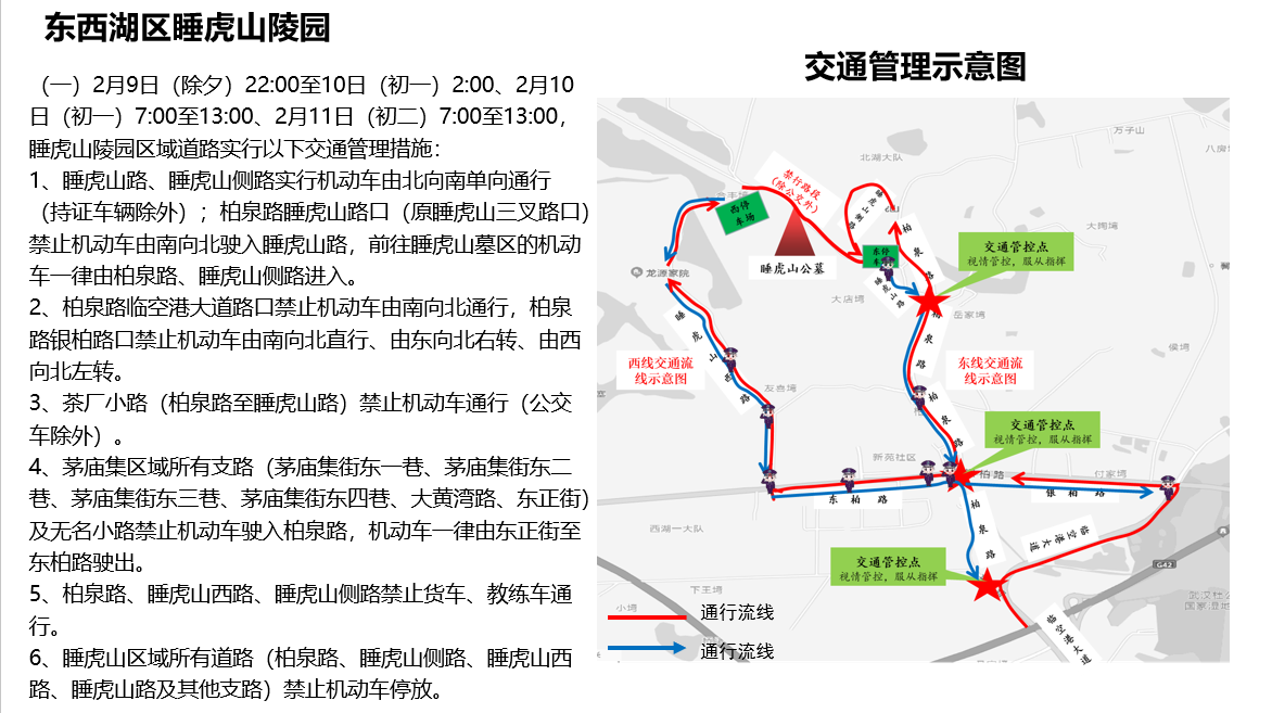 (一)2月9日(除夕)22:00至10日(初一)2:00、2月10日(初一)7:00至13:00、2月11日(初二)7:00至13:00,睡虎山陵园区域道路实行以下交通管理措施: