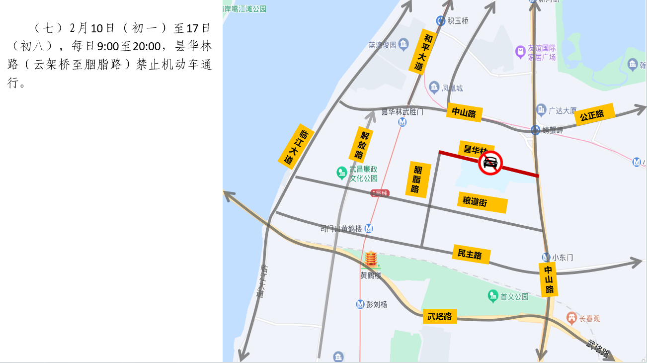 (七)2月10日(初一)至17日(初八),每日9:00至20:00,昙华林路(云架桥至胭脂路)禁止机动车通行。