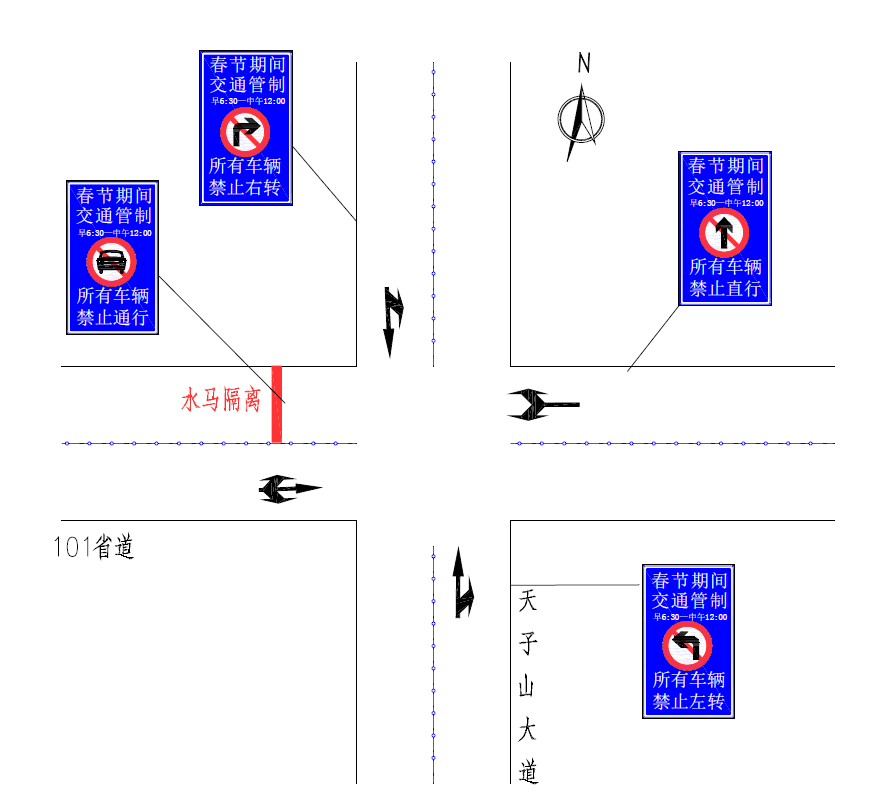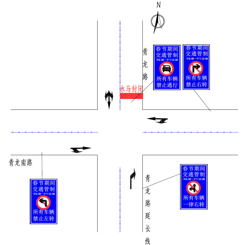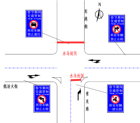 (三)青龙路青龙南街路口禁止机动车由南向北直行、由西向北左转、由东向北右转。