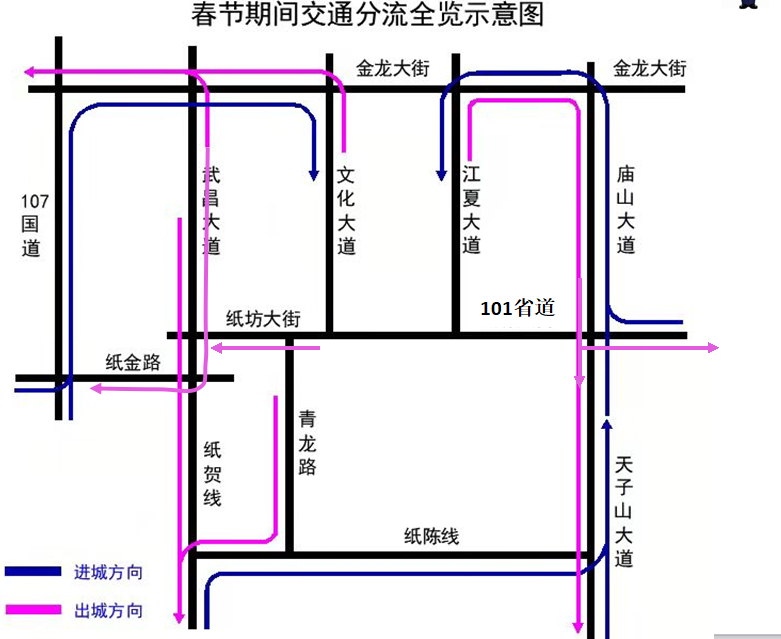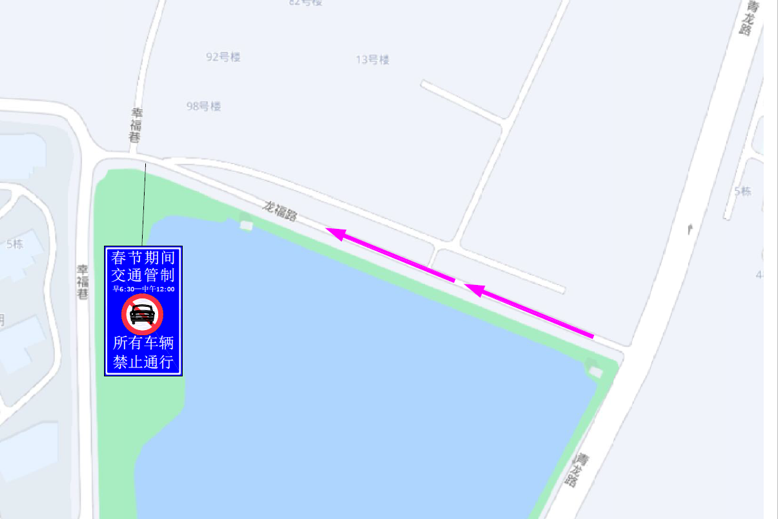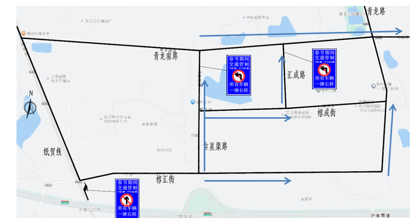 2月9日(除夕)至12日(初三),每日7:00至12:00,青龙山、纸坊周边区域道路实行以下交通管理措施: