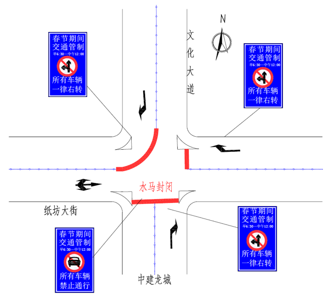 (六)纸坊大街文化大道路口禁止机动车由南向北直行、由南向西左转、由东向西直行、由东向南左转。