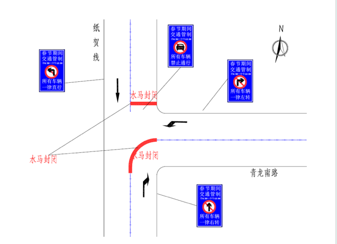 (一)纸贺线青龙南街路口禁止机动车由南向北直行、由东向北右转、由北向东左转。