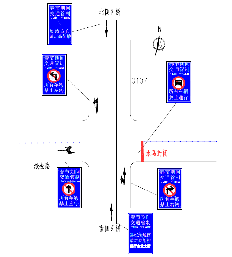 (十一)纸金路107国道路口禁止机动车由南向东右转、由西向东直行、由北向东左转。