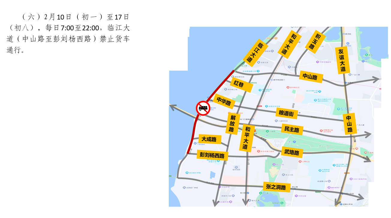 (六)2月10日(初一)至17日(初八),每日7:00至22:00,临江大道(中山路至彭刘杨西路)禁止货车通行。