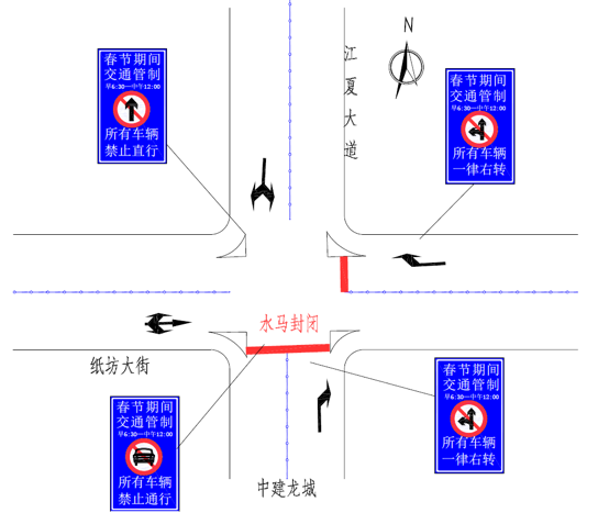 (七)纸坊大街江夏大道路口禁止机动车由南向北直行、由南向西左转、由北向南直行、由东向西直行、由东向南左转。