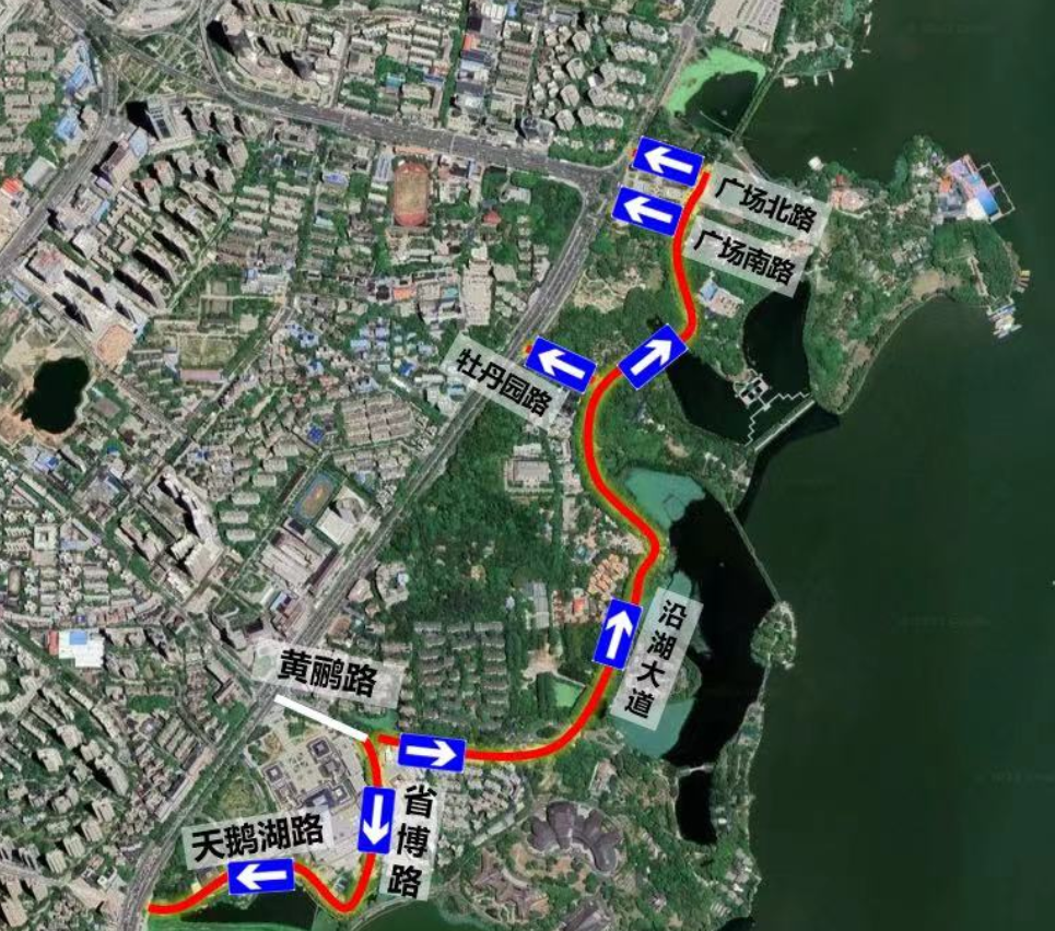 6、沿湖大道(黄鹂路至广场北路)实行机动车由南向北(黄鹂路往广场北路方向)单向通行。