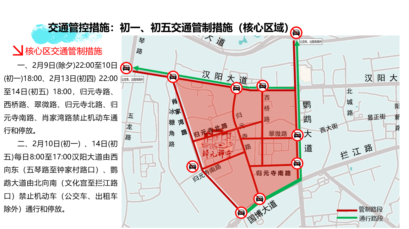 (一)2月9日(除夕)22:00至10日(初一)18:00、2月13日(初四)22:00至14日(初五)18:00,归元寺路、西桥路、翠微路、归元寺北路、归元寺南路、肖家湾路禁止机动车及非机动车通行和停放。