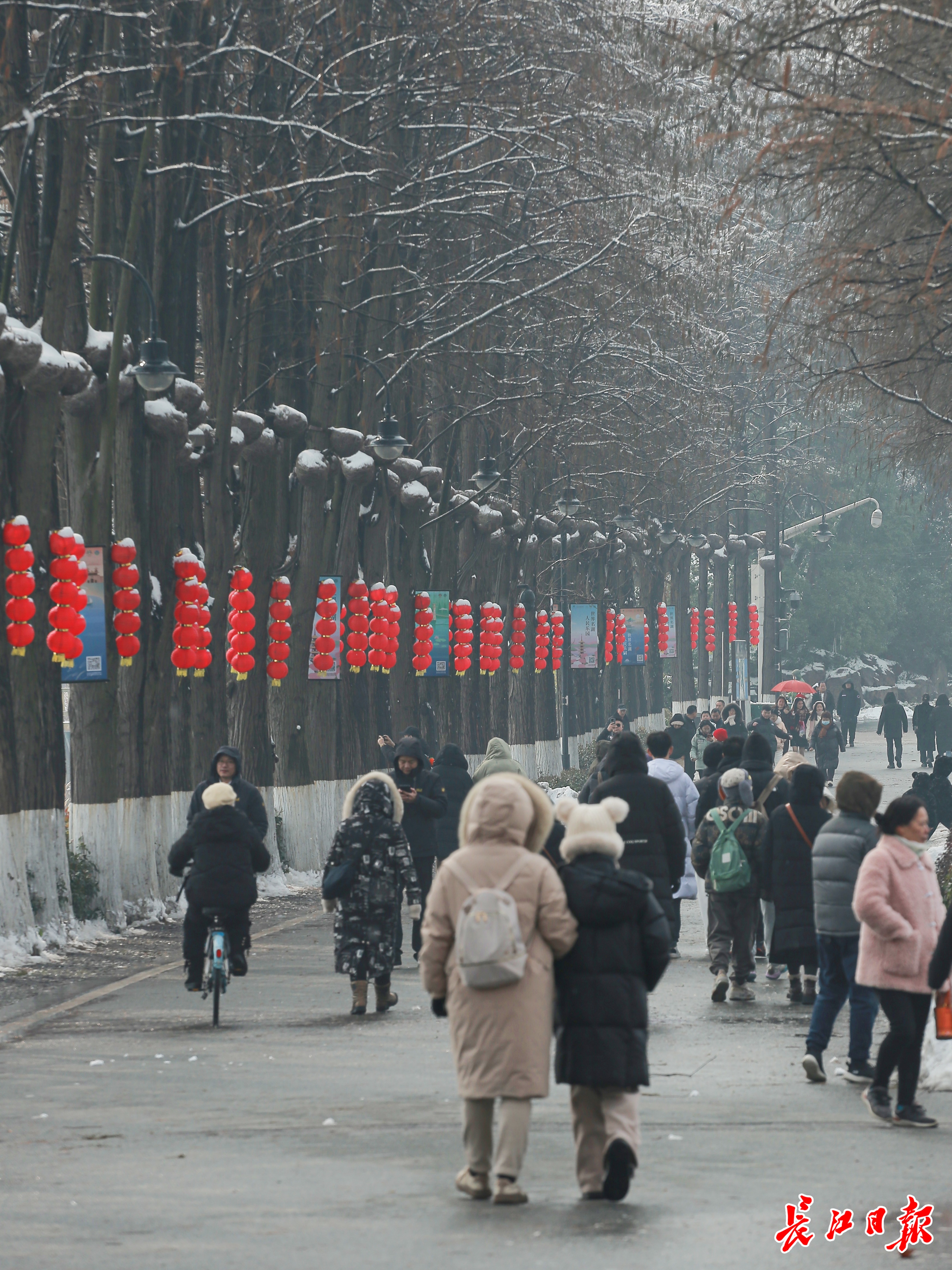 雪霁天晴,春节来临,东湖风景区各处都挂上红灯笼,春节氛围浓烈。从梨园广场来到东湖听涛景区,首先映入眼帘的是三个一组的红灯笼错落有致地挂在树枝上,三五成群的市民游客从树下走过,脸上洋溢着幸福的笑容。