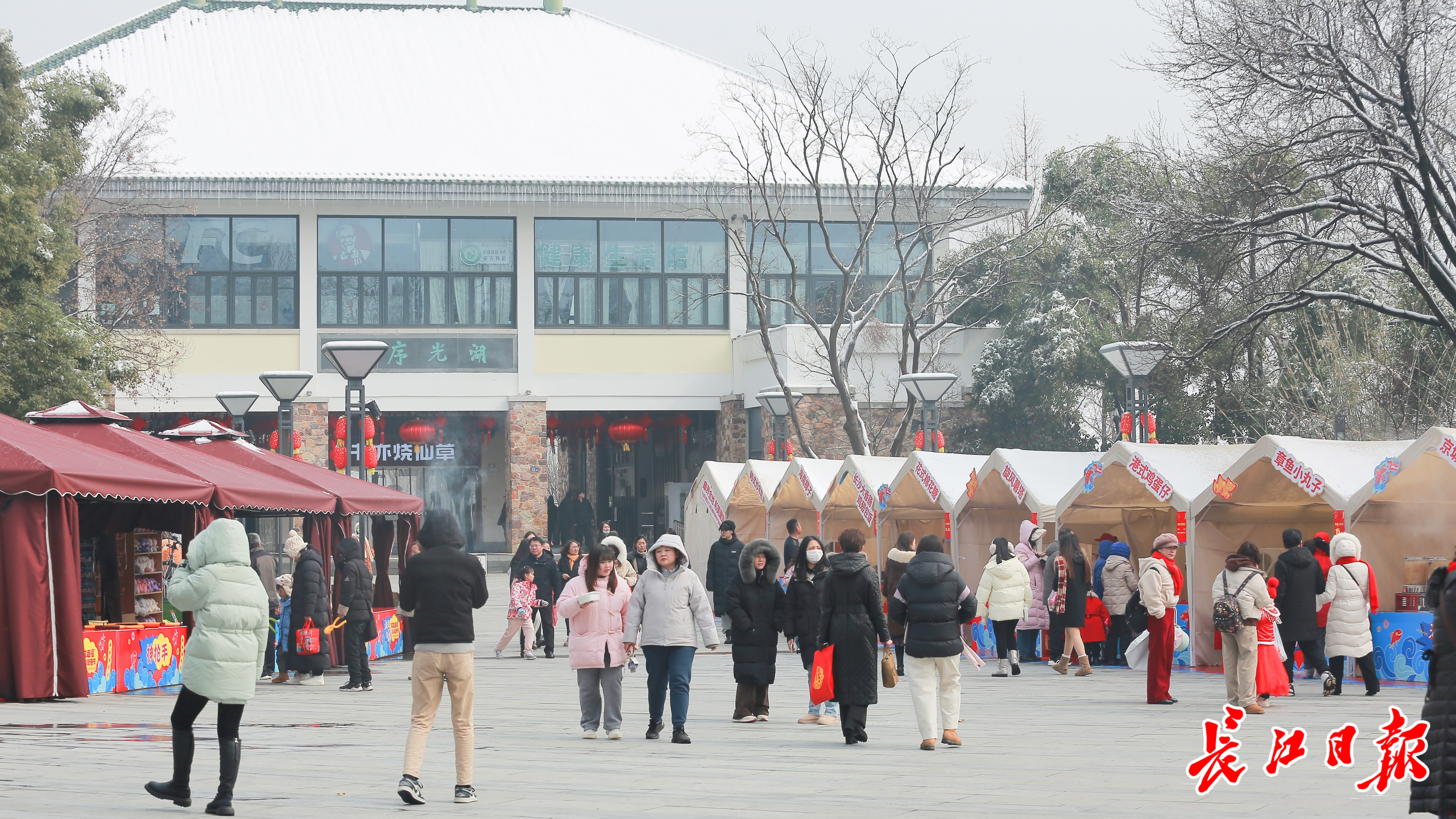 在东湖磨山景区,年味最浓的当数东湖梅园。记者看到,在东湖梅园大门口处,“红梅万树一齐开,且喜东湖春早到”的喜庆春联。梅园大门口附近,一串串红灯笼挂在树枝上,红彤彤一片。