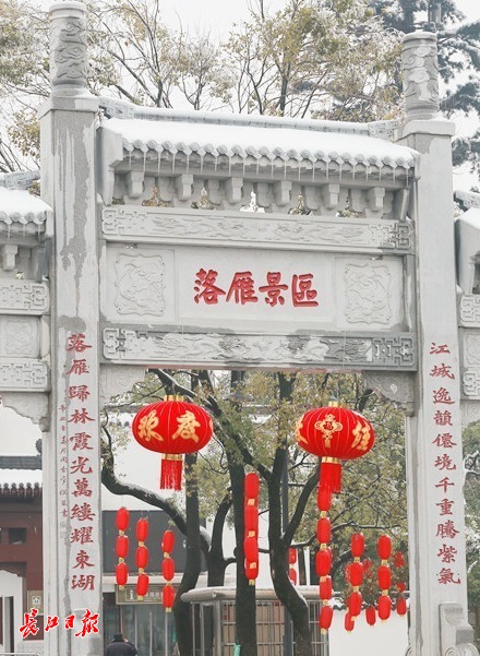 东湖落雁景区、马鞍山森林公园的大门处红灯笼也将景区装扮起来,在阳光的照射下格外艳丽。市民游客站在景区门口,或自拍或合影留念,其乐融融。