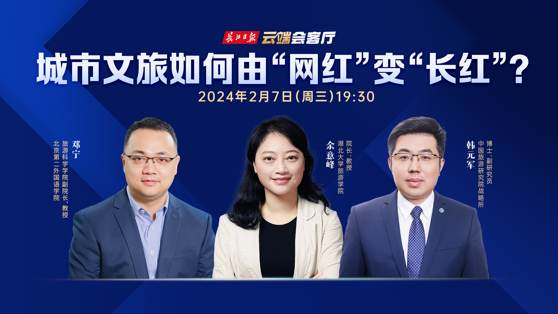 近日,长江日报云端会客厅邀请北京第二外国语学院旅游科学学院副院长、教授邓宁,湖北大学旅游学院院长、教授余意峰,中国旅游研究院战略所博士、副研究员韩元军三位嘉宾做客,围绕相关问题展开讨论。