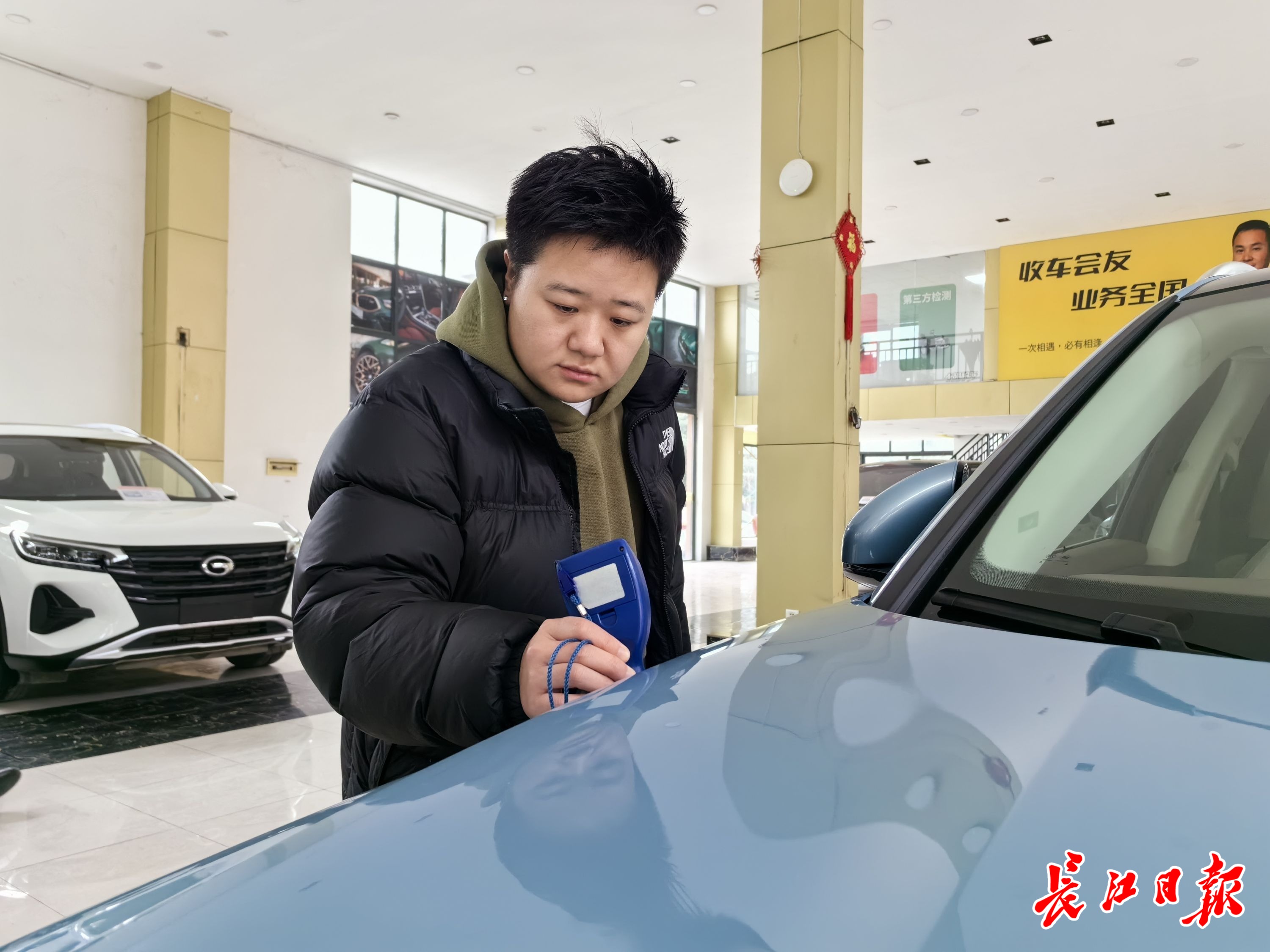 周梦洁正在检测车辆。 记者覃柳玮 摄