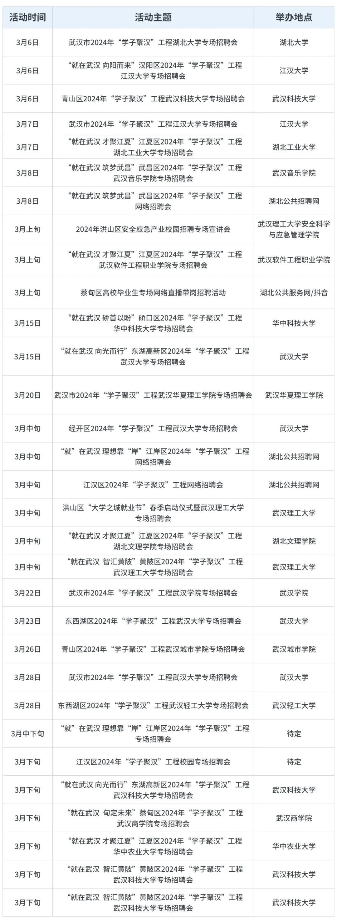 此外,2024年全市将举办高校毕业生招聘活动200场以上,3月招聘会安排如下: