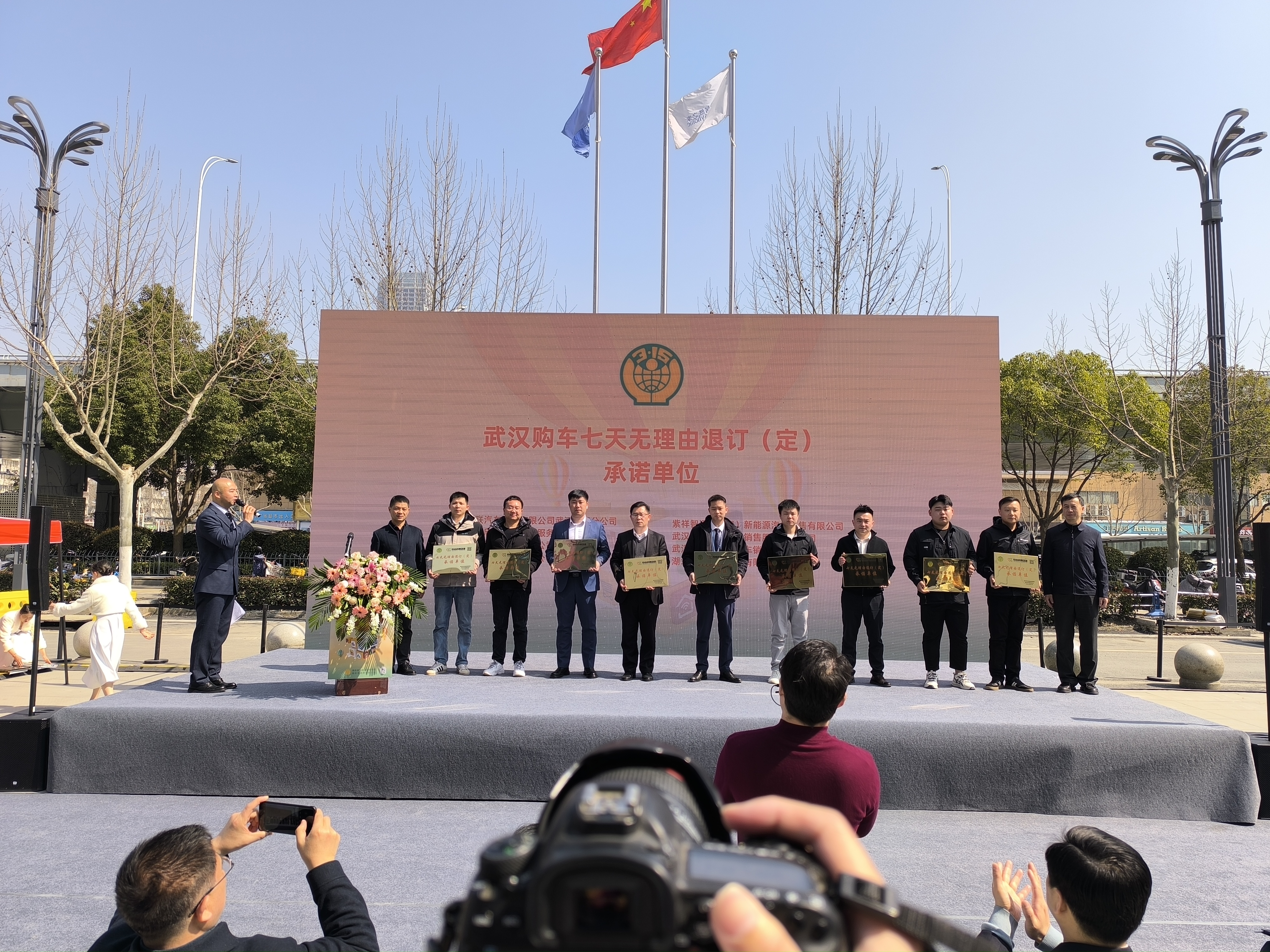 在武昌销品茂举行的汽车行业七天无理由退订(定)普法宣教活动上,省、市、区市场监管部门相关负责人为自愿加入武汉市购车七天无理由退订(定)活动的承诺单位授牌。