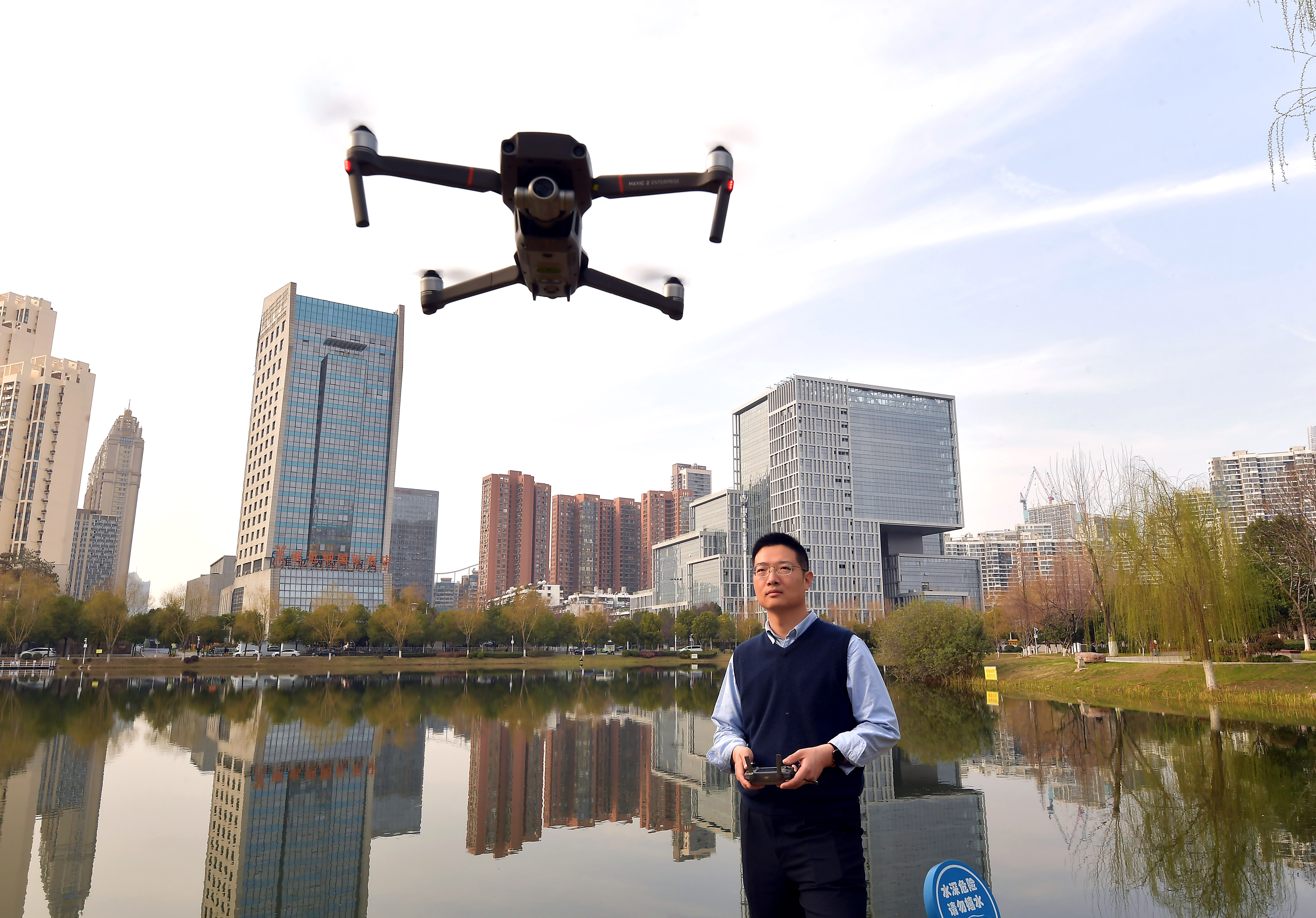 武昌区湖泊维护站副站长王聪操控无人机,对内沙湖沉水植物进行空中观测。记者刘斌 摄
