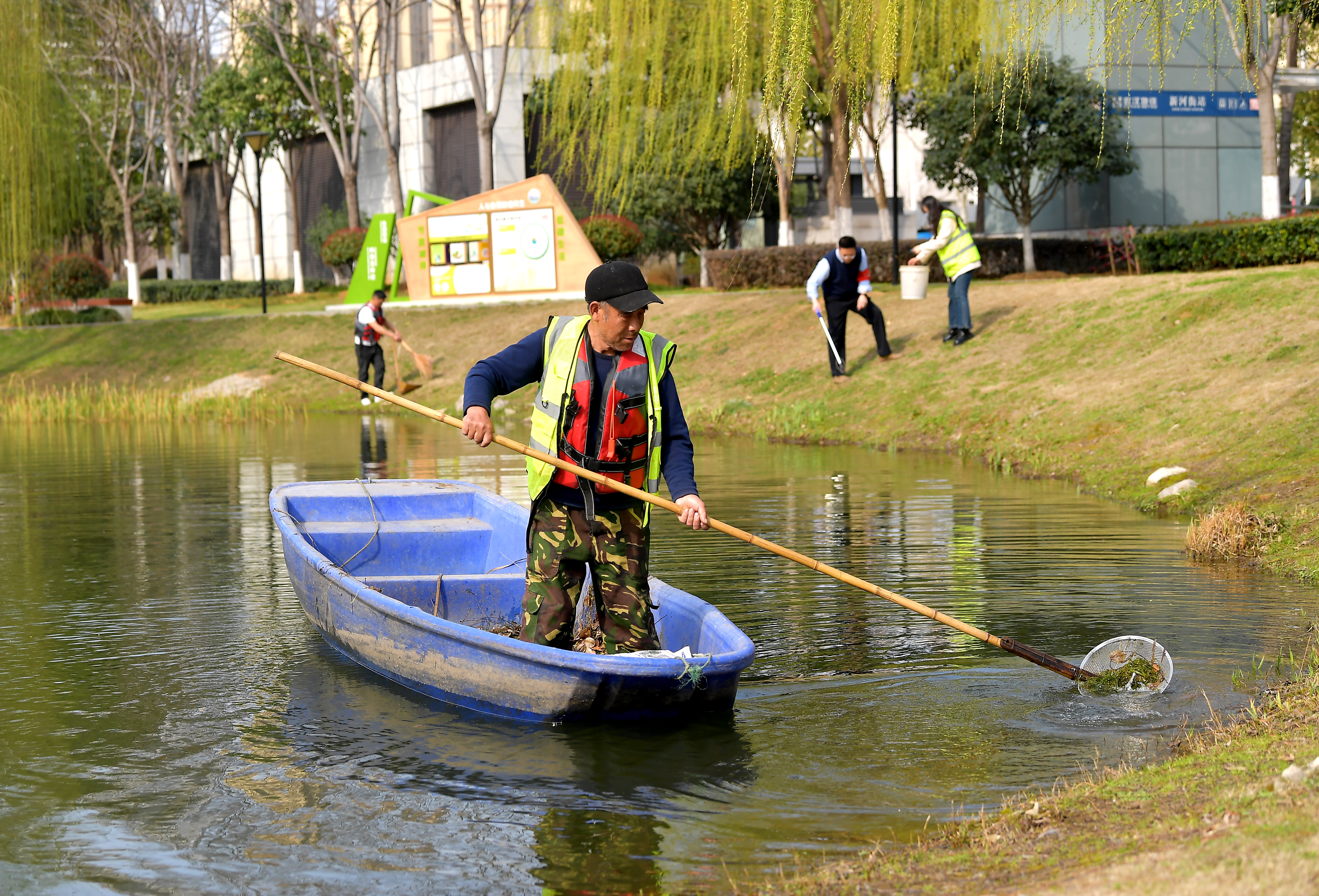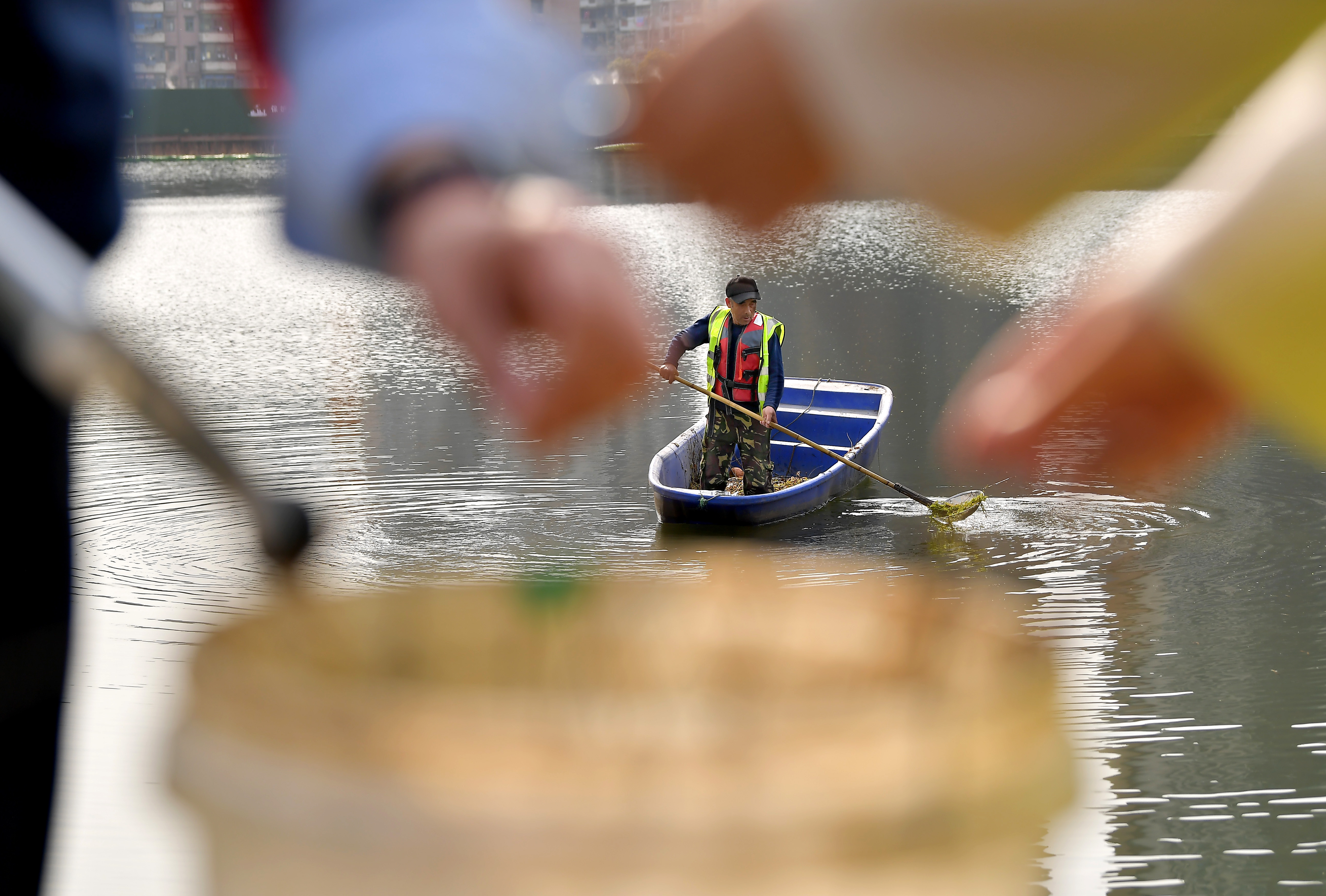 湖面上,养护人员一边打捞湖面漂浮物,一边观察水中植物形态,适时修剪,防止其因过度生长、浮于水面后影响自净功能。“植物尖端离水面应保持10公分以上,且形态美观,每过一段时间,就要对它们修剪一次”。