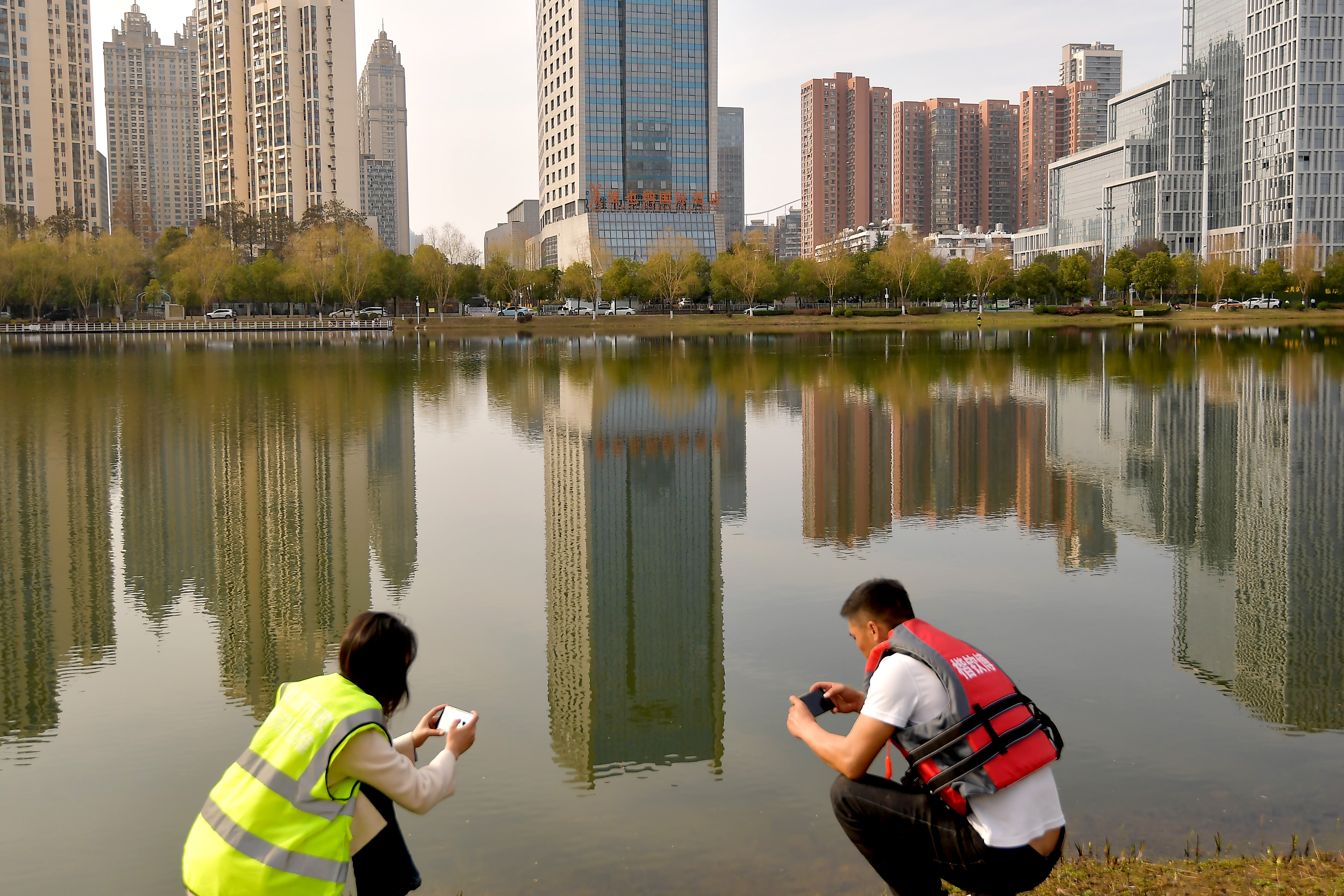 武昌区湖泊维护站工作人员正在观察沉水植物生长情况。记者刘斌 摄