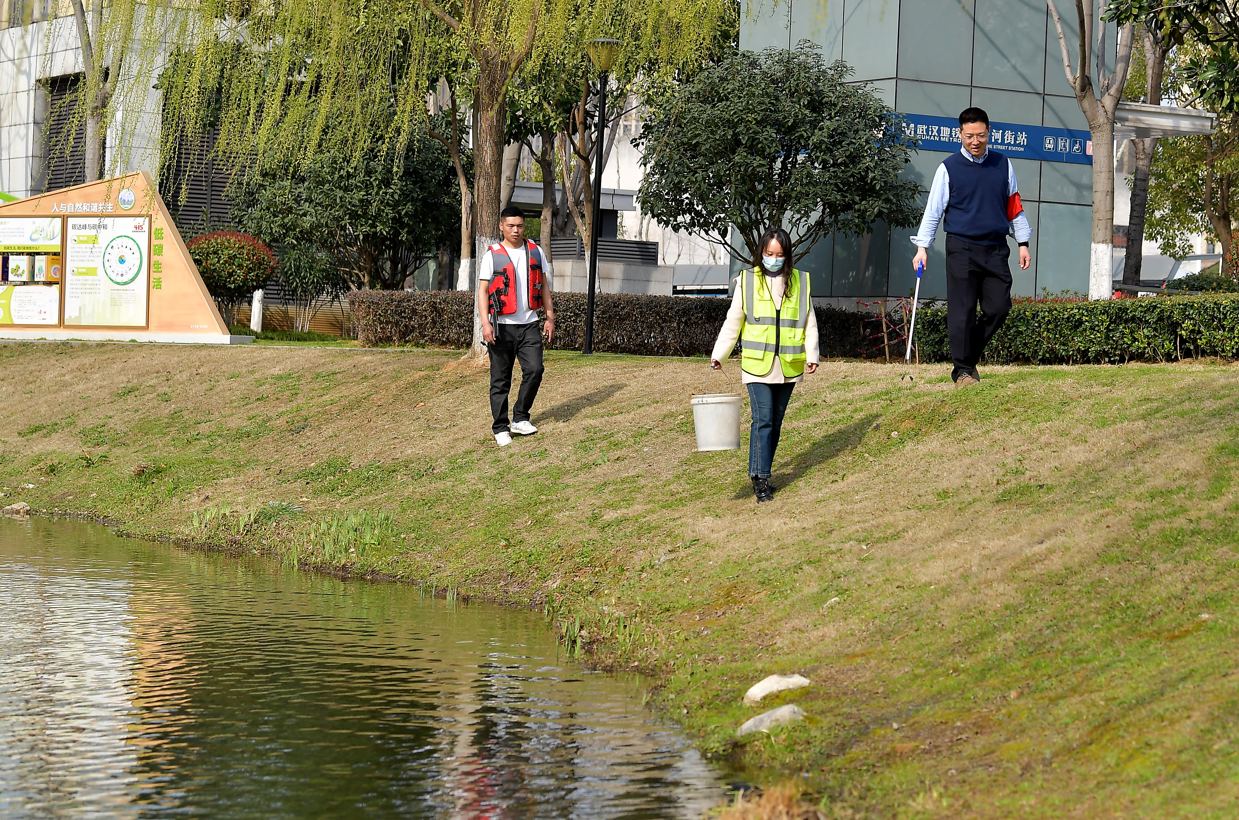内沙湖岸边,武昌区湖泊维护站副站长王聪(右)带领养护人员现场巡查。记者刘斌 摄