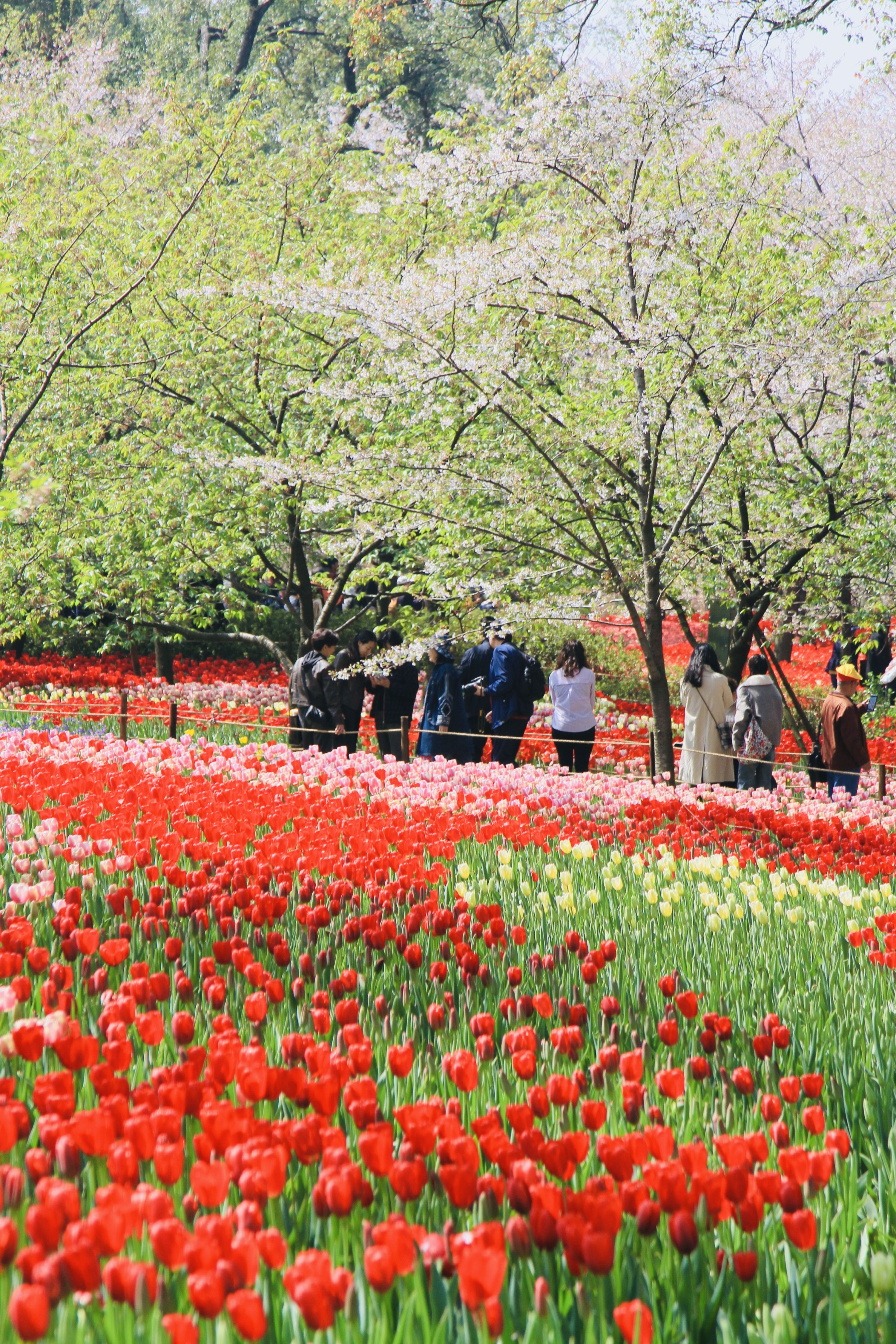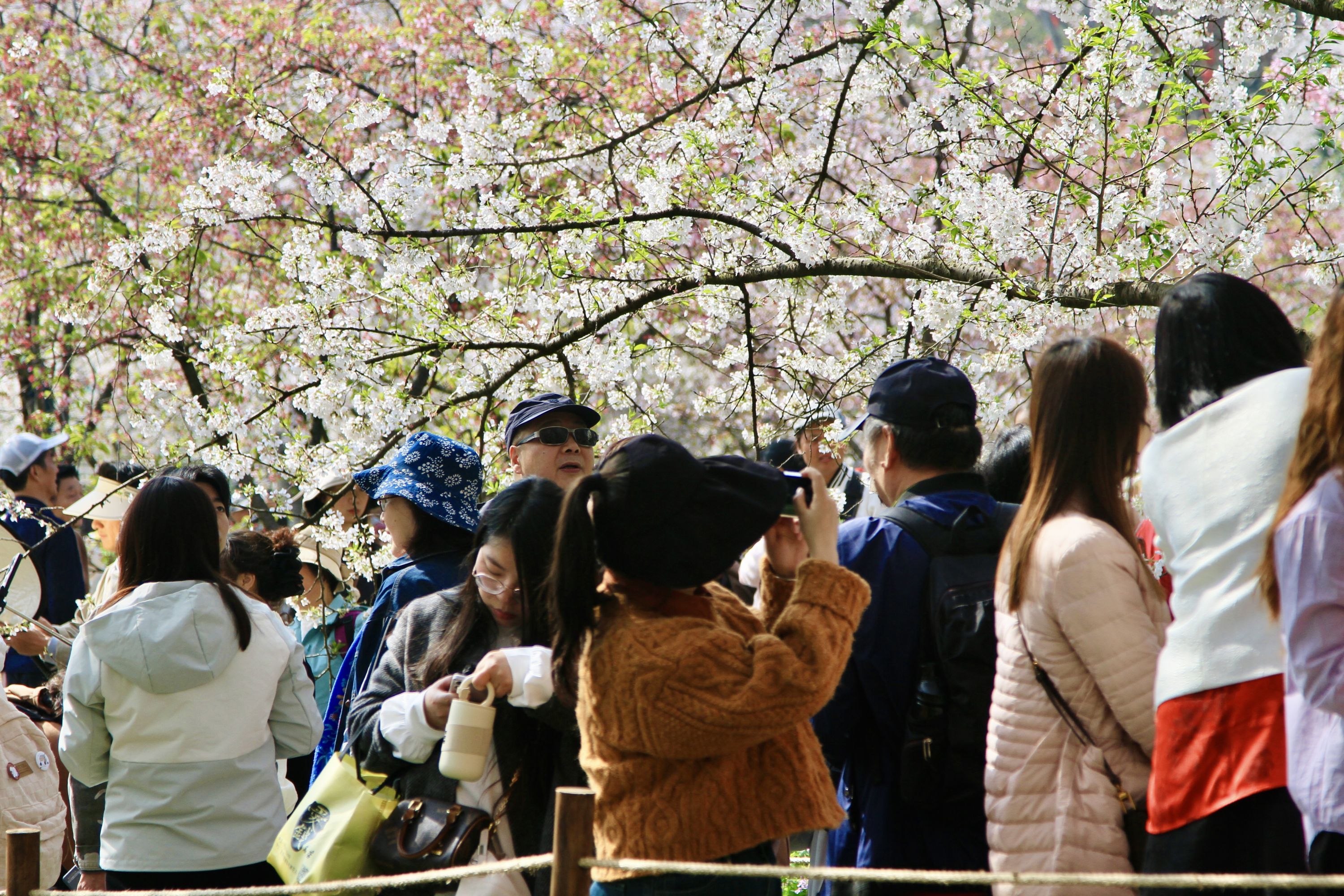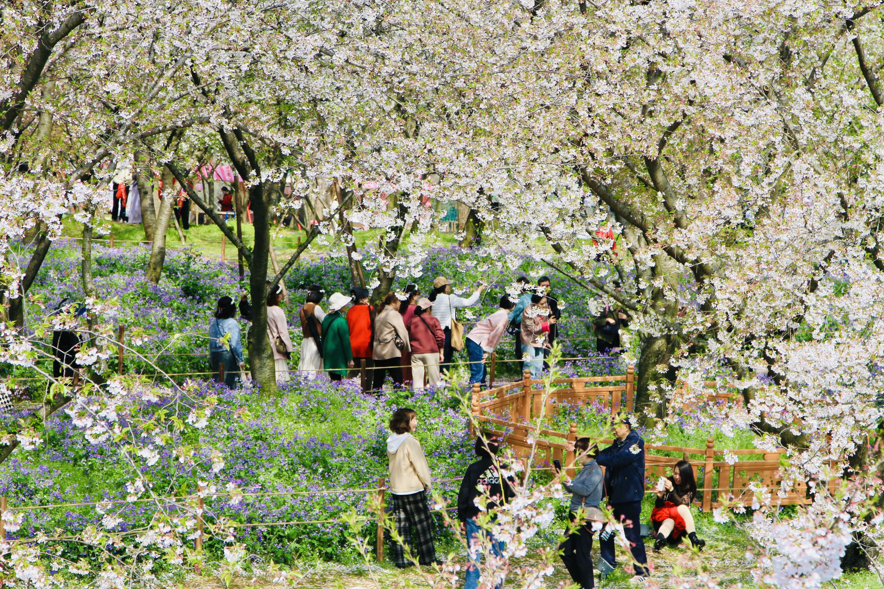 “目前园内五成以上中樱品种盛放枝头,正值最佳观赏期。此外,郁金香、油菜花、二月兰、连翘、喷雪花等春花正在园内盛放,为游客呈现立体的花海景观,同样非常值得欣赏。”东湖樱花园工作人员介绍。