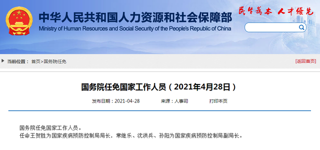 4月28日,据人社部官网消息,国务院任免国家工作人员。任命王贺胜为国家疾病预防控制局局长,常继乐、沈洪兵、孙阳为国家疾病预防控制局副局长。