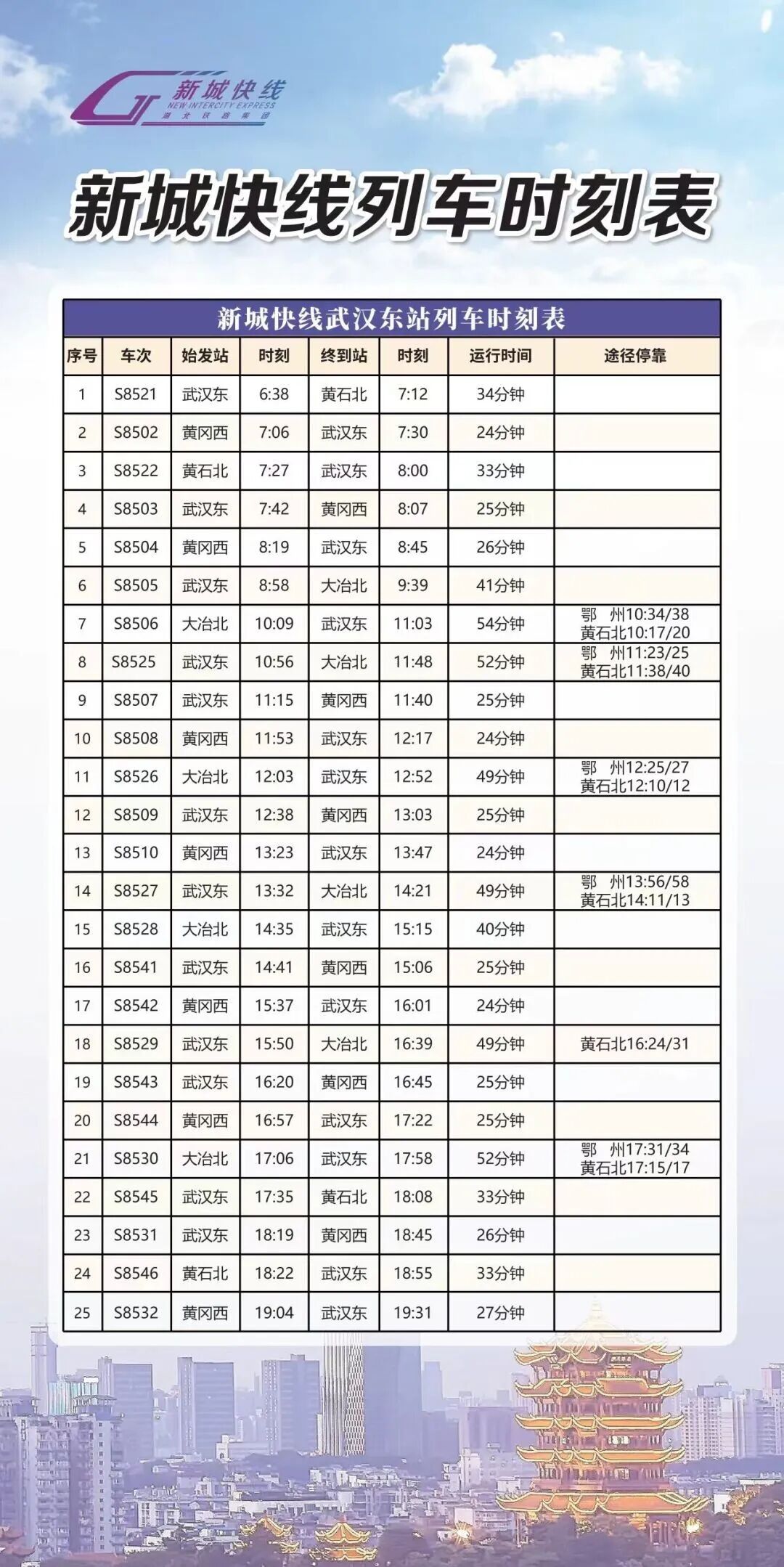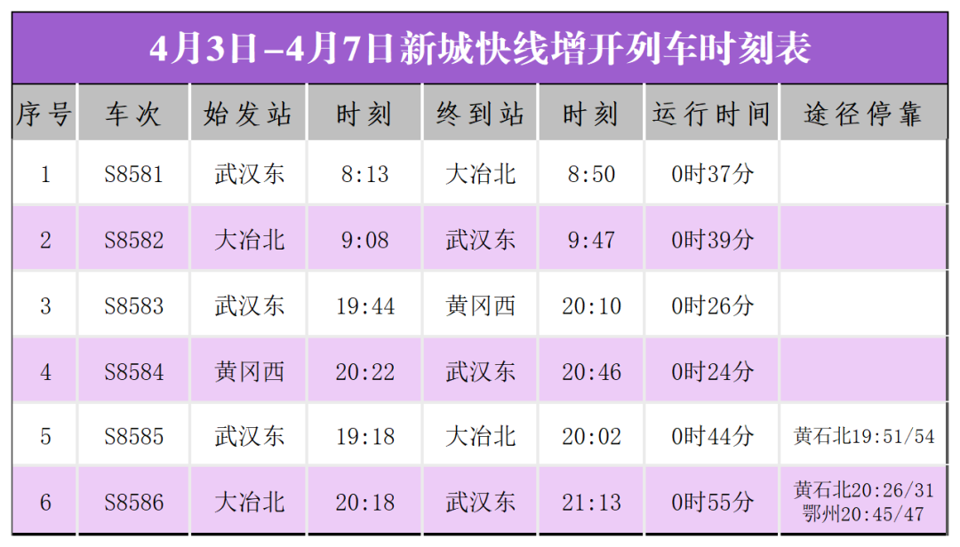 节假日前后4月3日至7日期间,湖北城铁公交“新城快线”每日加开客车6列,其中早班2列、晚班4列,最晚班S8586次列车21:13分到达武汉东站。日常图定25列新城快线仍然正常开行。此外,国铁21列常态开行。