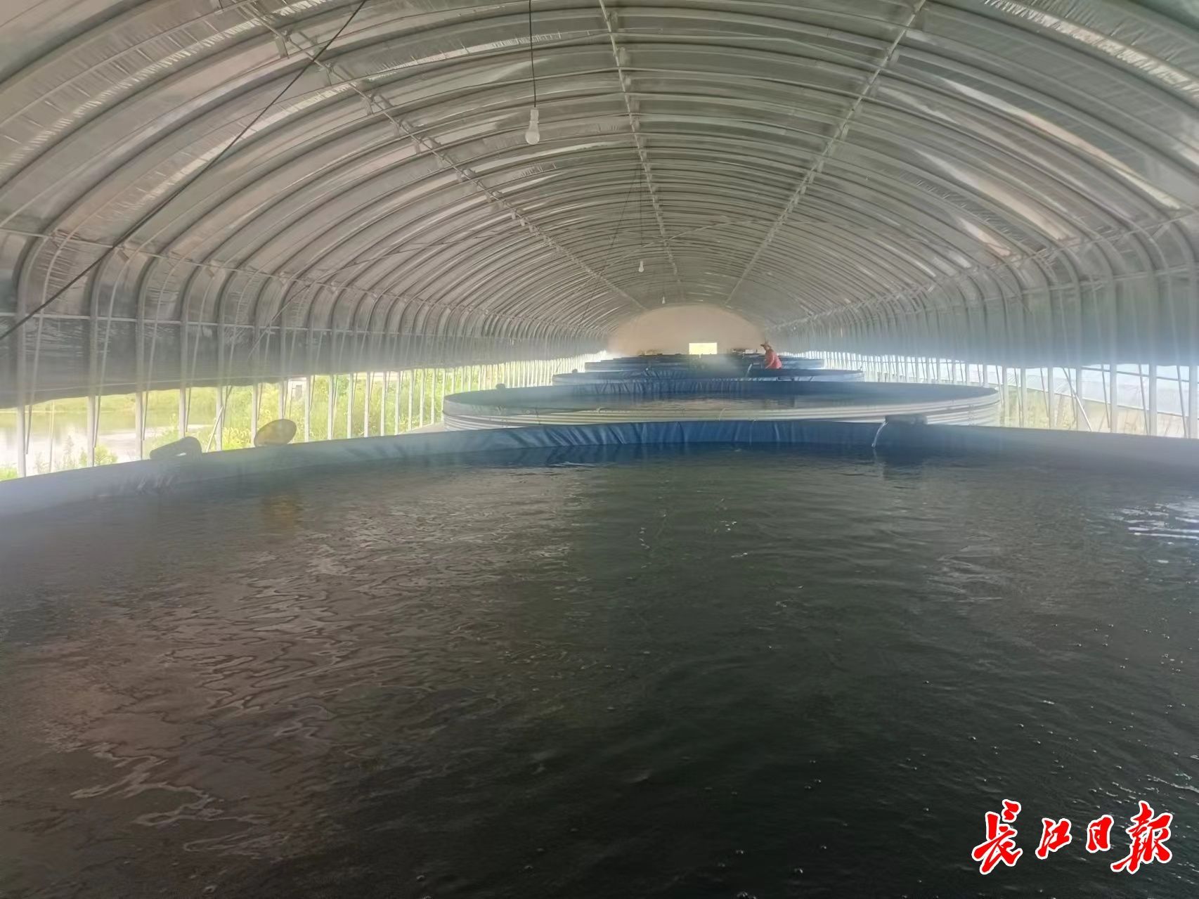 目前,合作社养殖基地正在进行扩建,计划新增2万立方米养殖温棚,用来繁育“长江三鲜”。温棚里,井水循环管道、室温水温监控器、喷水式增氧机、循环水沉淀池、尾水处理区等基础设施一应俱全,还安装了传感器,陆基圈养桶内的水温、溶氧、pH值等数据可实时传送到手机小程序中,动动手指就能管理鱼塘。
