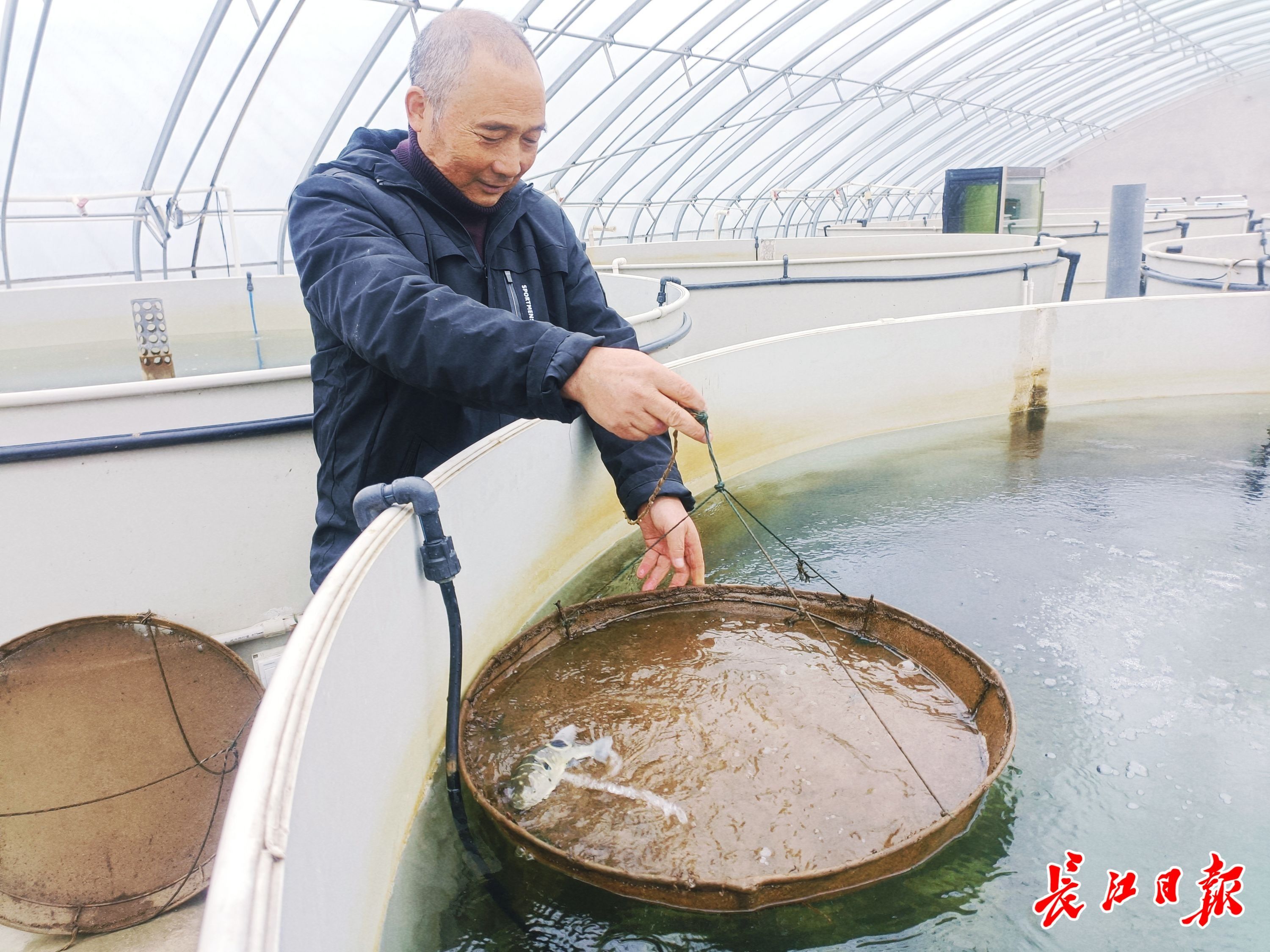 记者在保温大棚中看到,一个个圆形圈养桶整齐排列,每个桶里都设有排水口和导水管,水流不停循环。“这里导入的是30米深的井水。为了达到水体恒温,我们在基地里打了10口深井,井水全年温度稳定在17℃左右,非常适合用来调节水温。”陈国荣解释道,基地所在地靠近汉江,有天然的环境优势,地下水可达到饮用水标准,用来养鱼更生态。