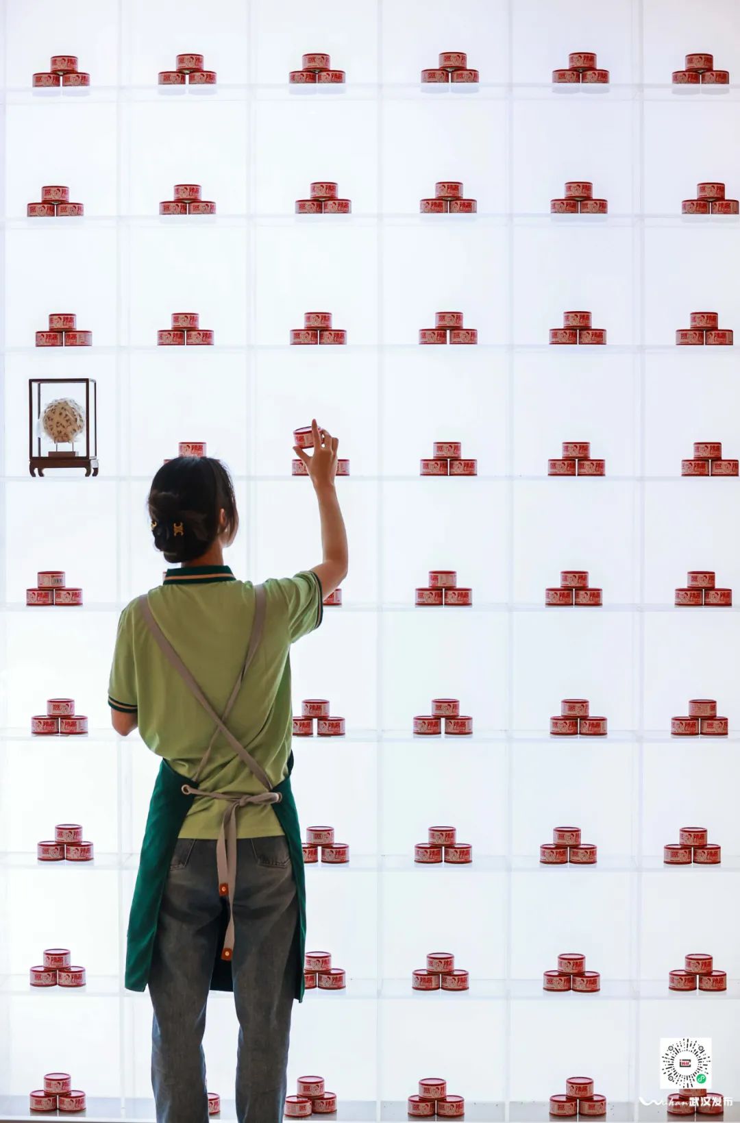 工作人员摆放“菇的辣克”品牌各种口味香菇辣酱。