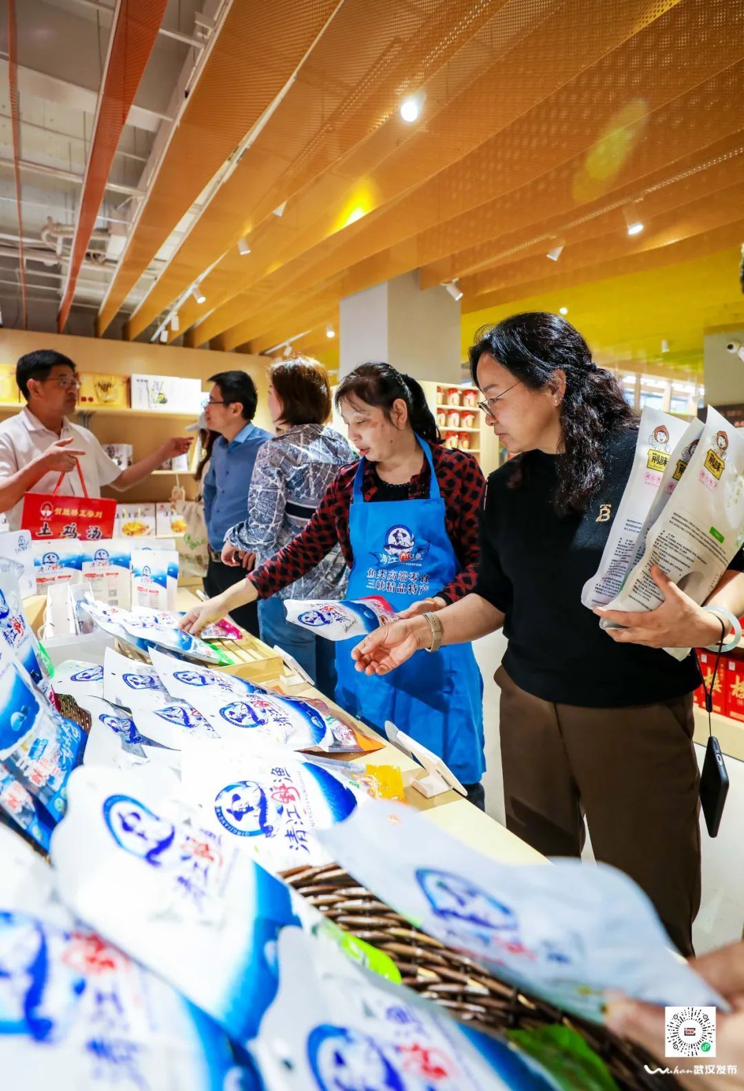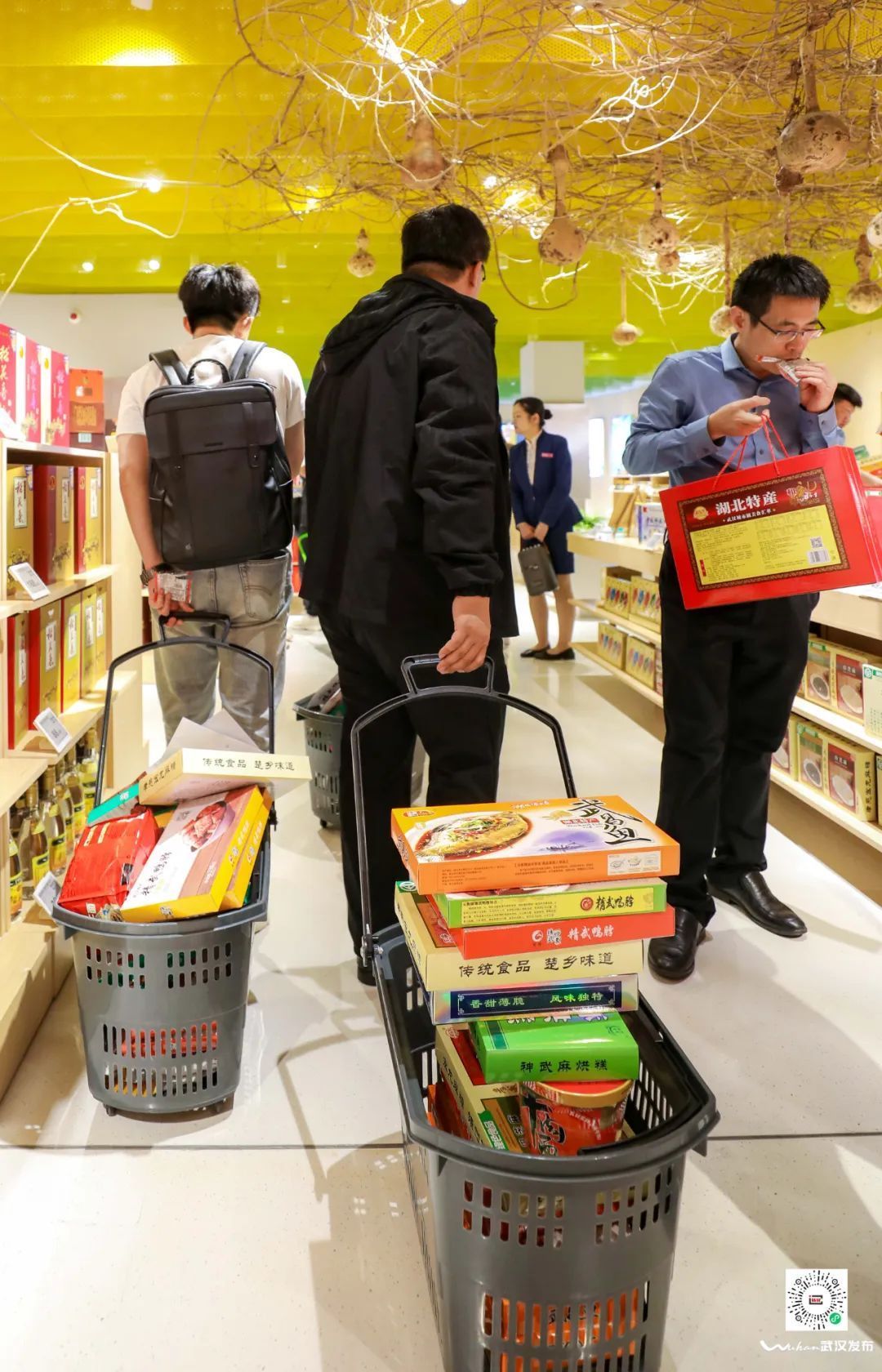 住在附近的彭阿姨,得知湖北农展今天开业,特意喊上“闺蜜团”一起来体验。每一位阿姨都拎着大包小包的购物袋,有雪花牛肉、香肠、有机蔬菜等。彭阿姨介绍,平时虽然在各大超市都能买到湖北各地的农产品,但是不像这里这么集中,能一次买到自己想要的各种产品。“这里是武商集团运营,我们特别信得过。商品品质有保证,价格也跟外面卖的差不多,非常有性价比。”