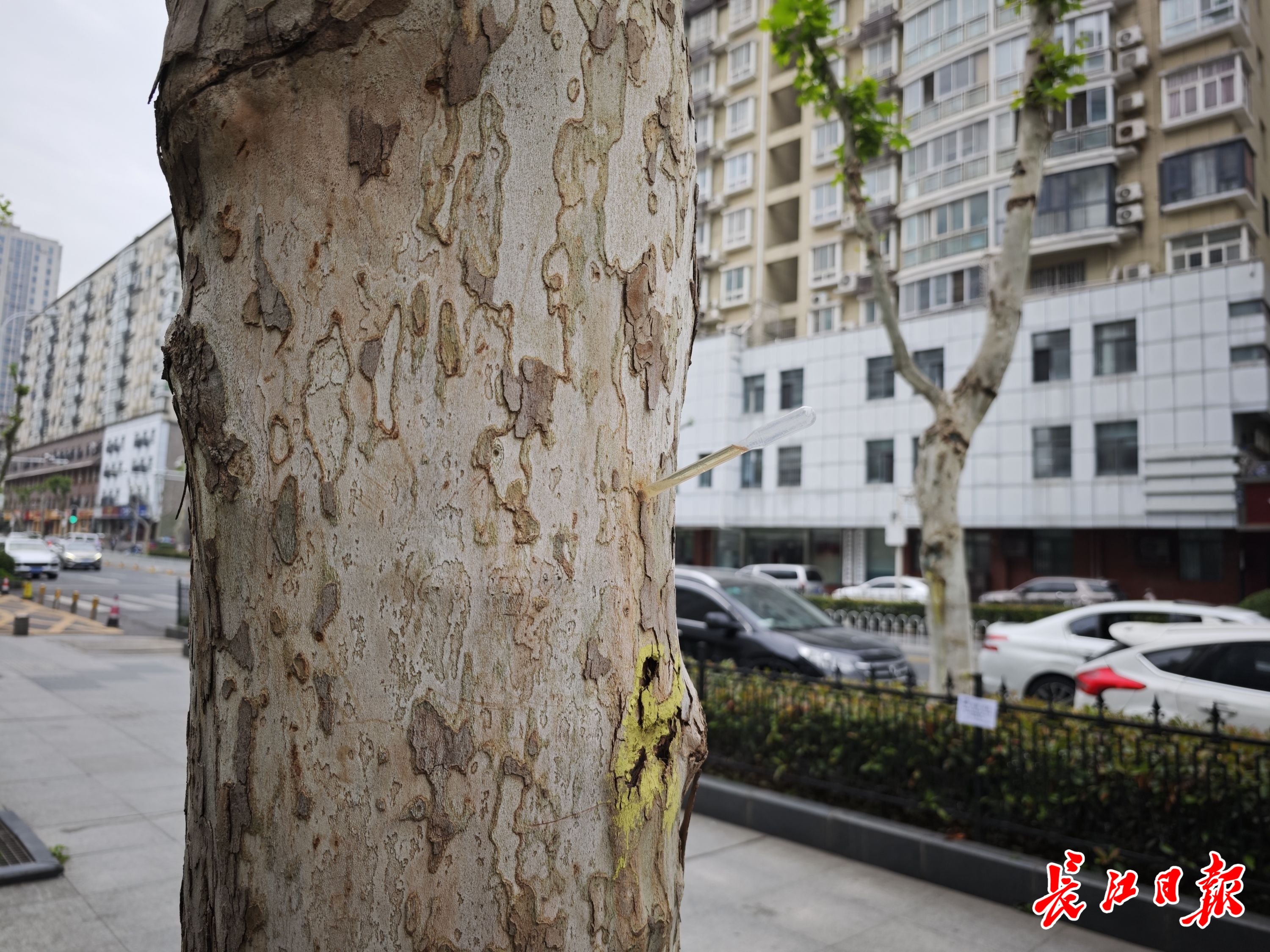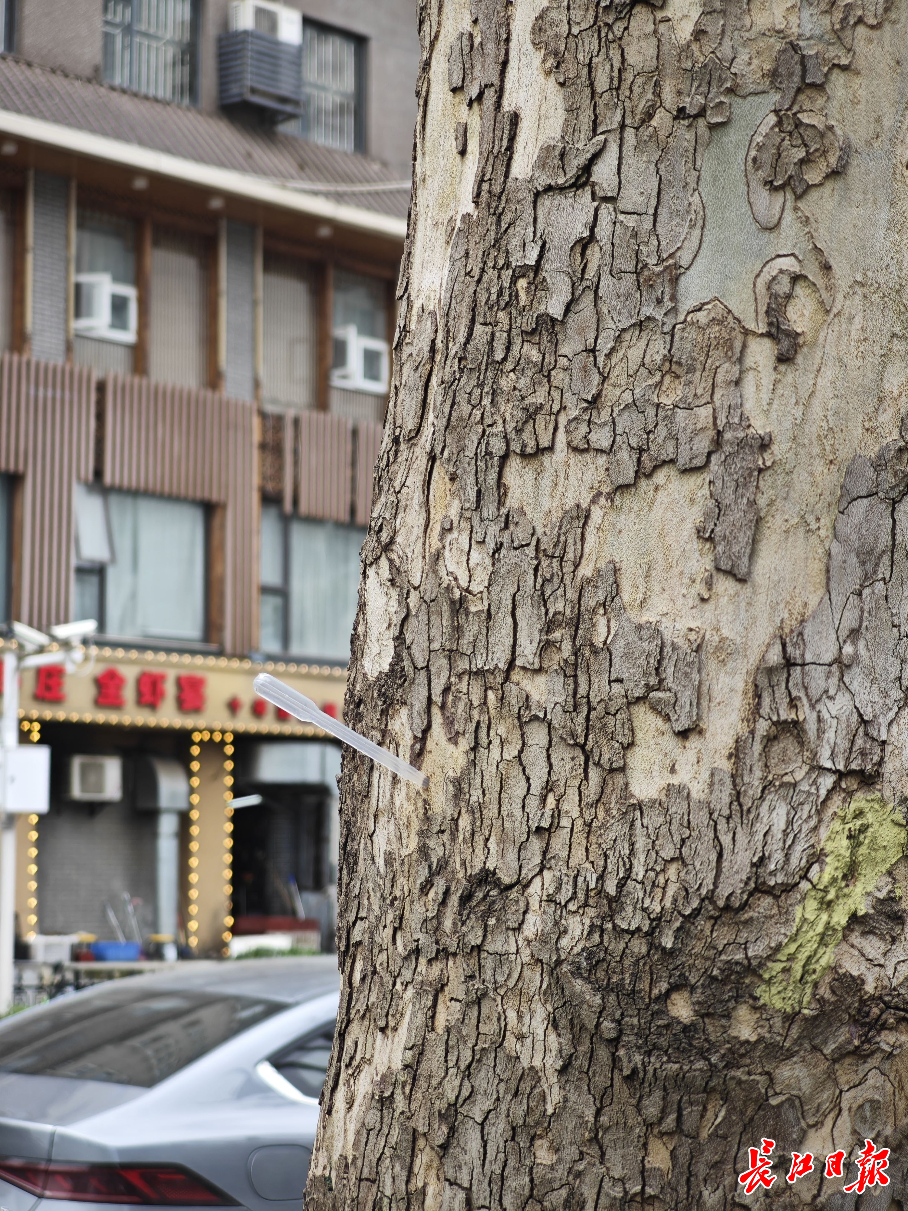 文治街北侧的法桐树上插着一根带有虫药的塑料管。 见习记者张锦涛 摄
