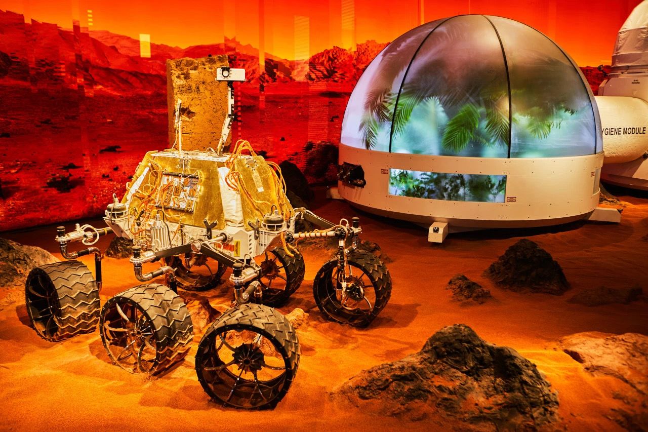 火星基地的模型和实拍幕布背景让人以为身处外太空,红色的火星地表、太空舱、火山沙丘、太空探测器等装置让人们一秒置身未来。