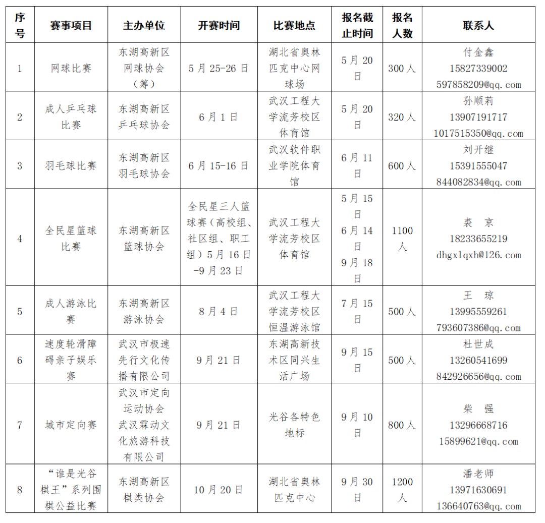 这8项赛事是光谷“文体十条”发布以来,首次由社会主体主办的全公益性赛事活动。报名参与方式如下: