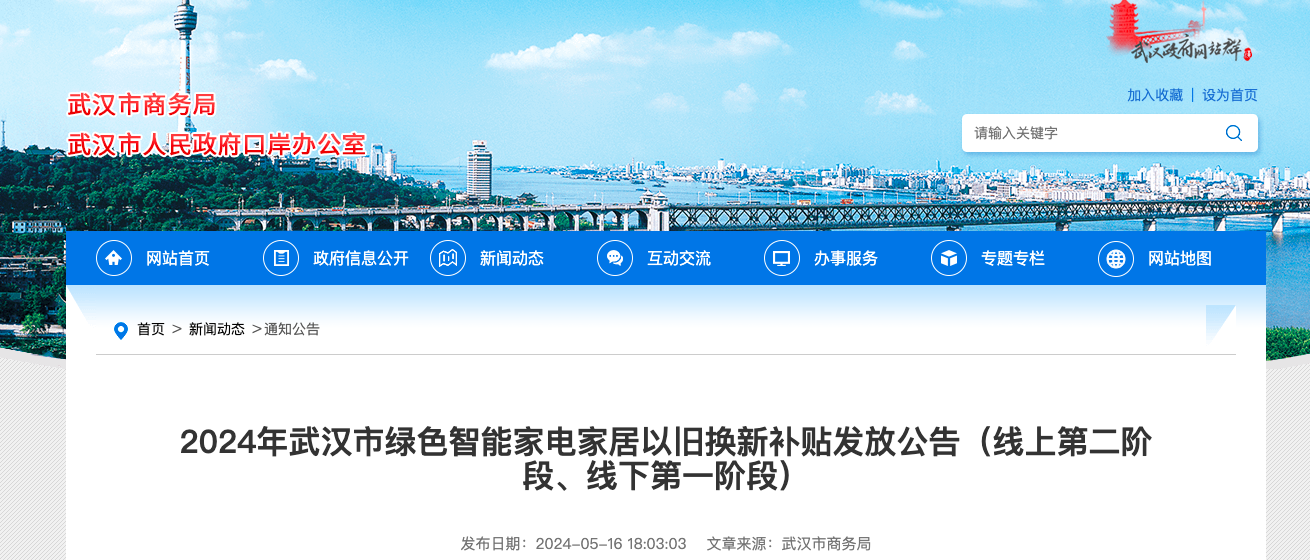2024年武汉市绿色智能家电家居以旧换新补贴发放公告(线上第二阶段、线下第一阶段)