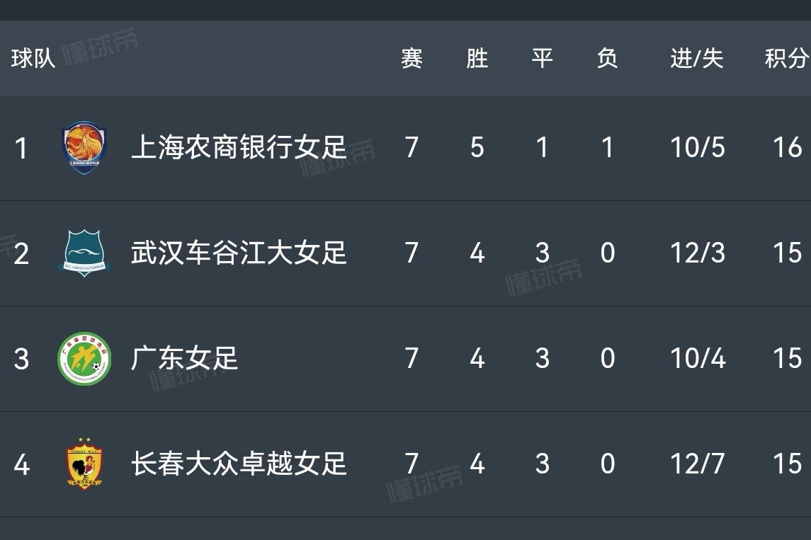 从目前积分榜形势看,武汉、上海、长春、广东四支球队竞争达到白热化。上海农商银行女足以16分暂时占据榜首,武汉、广东、长春同积15分,按净胜球优劣依次排在第二至第四位。这也意味着每轮比赛的结果都会令积分榜前四名的位置发生变化。