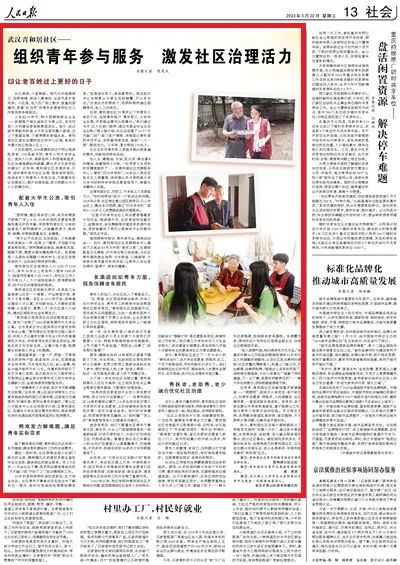 5月22日,《人民日报》刊发《武汉青和居社区——组织青年参与服务 激发社区治理活力(让老百姓过上更好的日子)》,点赞青山区工人村街道青和居社区多措并举,引导、组织青年参与社区治理,不断激发社区治理活力。