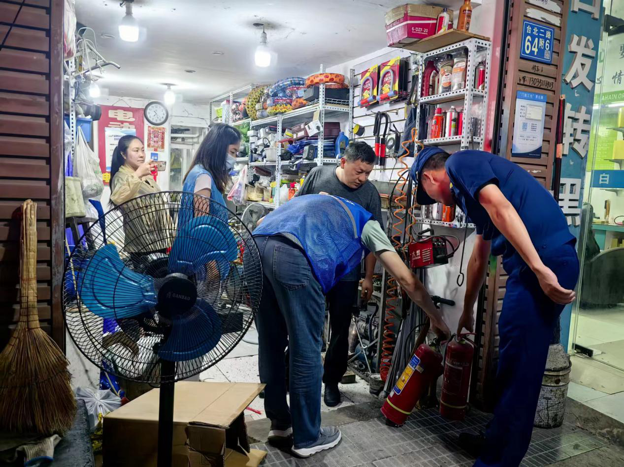 检查人员检查店铺内的消防器材。 通讯员汉消 摄