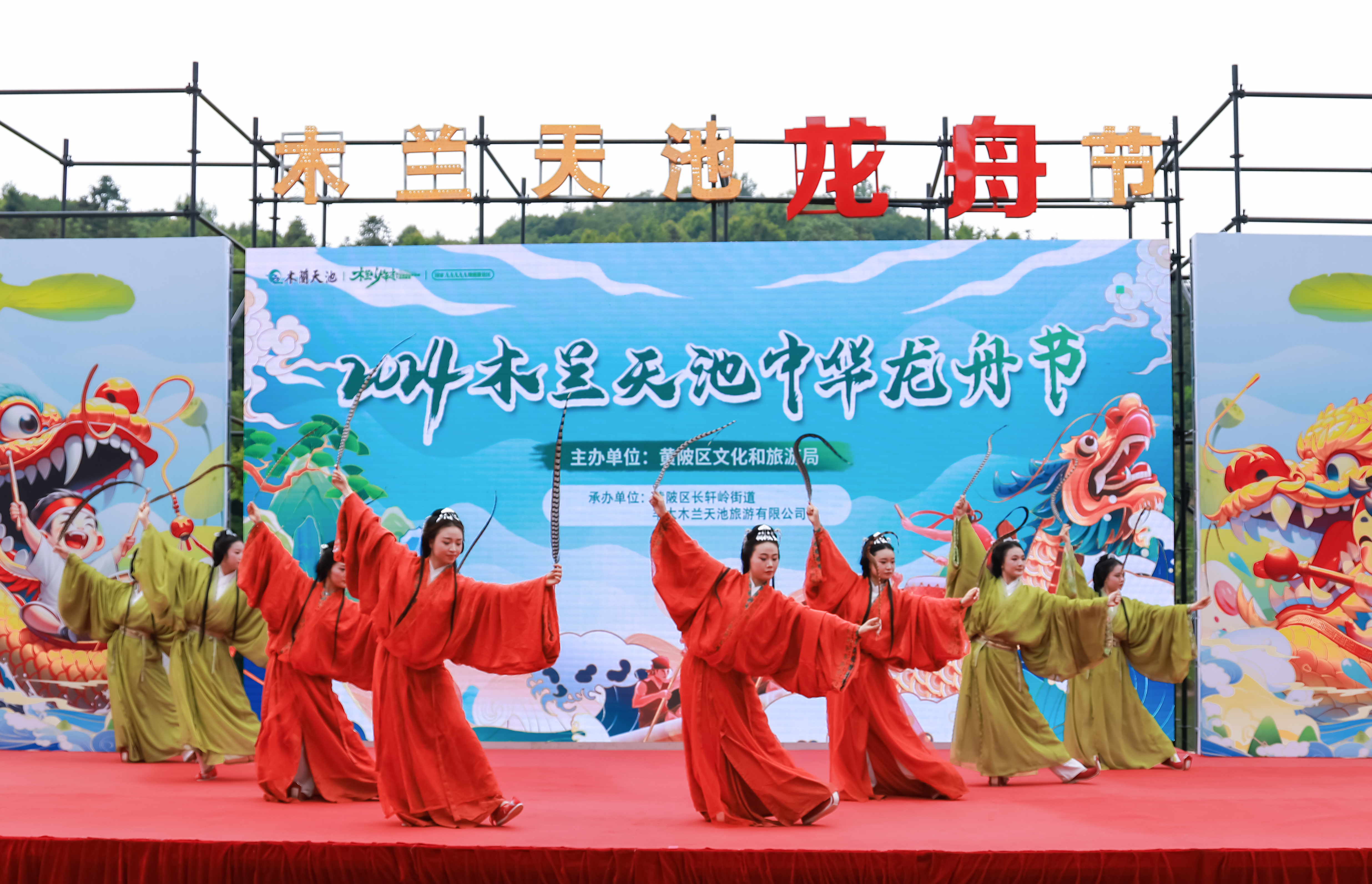 2024年木兰中华龙舟节是黄陂木兰天池第五年举办以端午为主题的活动。不同于往年,今年开幕式活动放在了园区朱家山寨。游客穿越森林大峡谷,在大天池处乘坐游船画舫即可到达活动现场。上午11时许,由天池艺术团带来的《楚韵乐舞》等节目律动声声、轻袖飘飘,古韵悠长。而富有仪式感的请龙头、为龙头点睛、披红绸给现场游客营造强烈的代入感。随着比赛打响,游客们纷纷举起手机、相机记录下这振奋人心的一刻。陈女士一边为选手呐喊,一边拍照,她说:“时隔多年,再次来到木兰天池,发现木兰天池更大了,可以玩的项目更多了。”