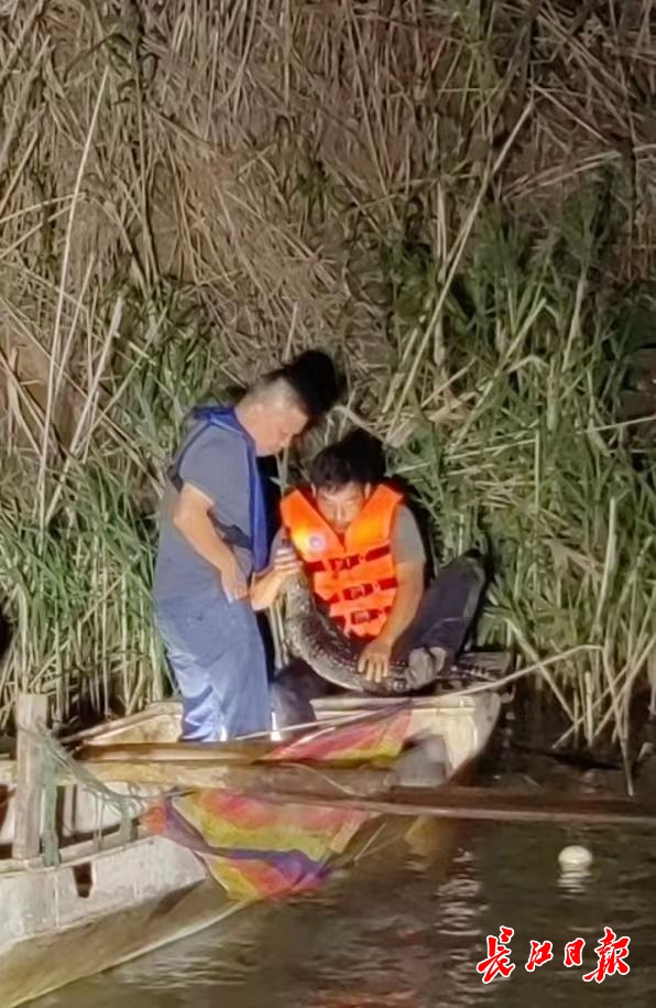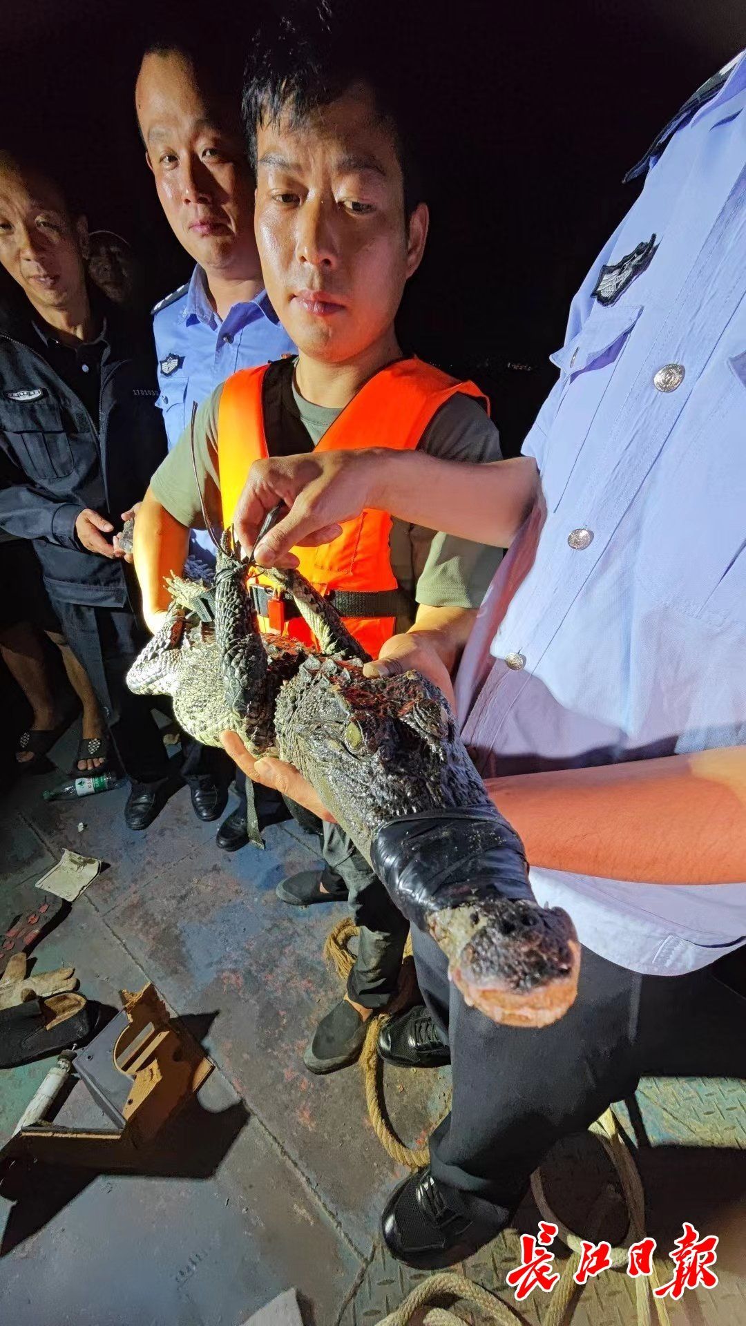 长江日报记者在另一艘船上亲眼见证:随着现场指挥员的一声令下,武汉养鳄专家胡庆其使用大号抄网兜住鳄鱼,然后出手如电,将鳄鱼拎出水面,迅速将它按压在船头,用胶带缠住嘴部,用捆扎带将其四肢反绑,至此,第二条鳄鱼成功捕获。整个过程行云流水,不超过2分钟。