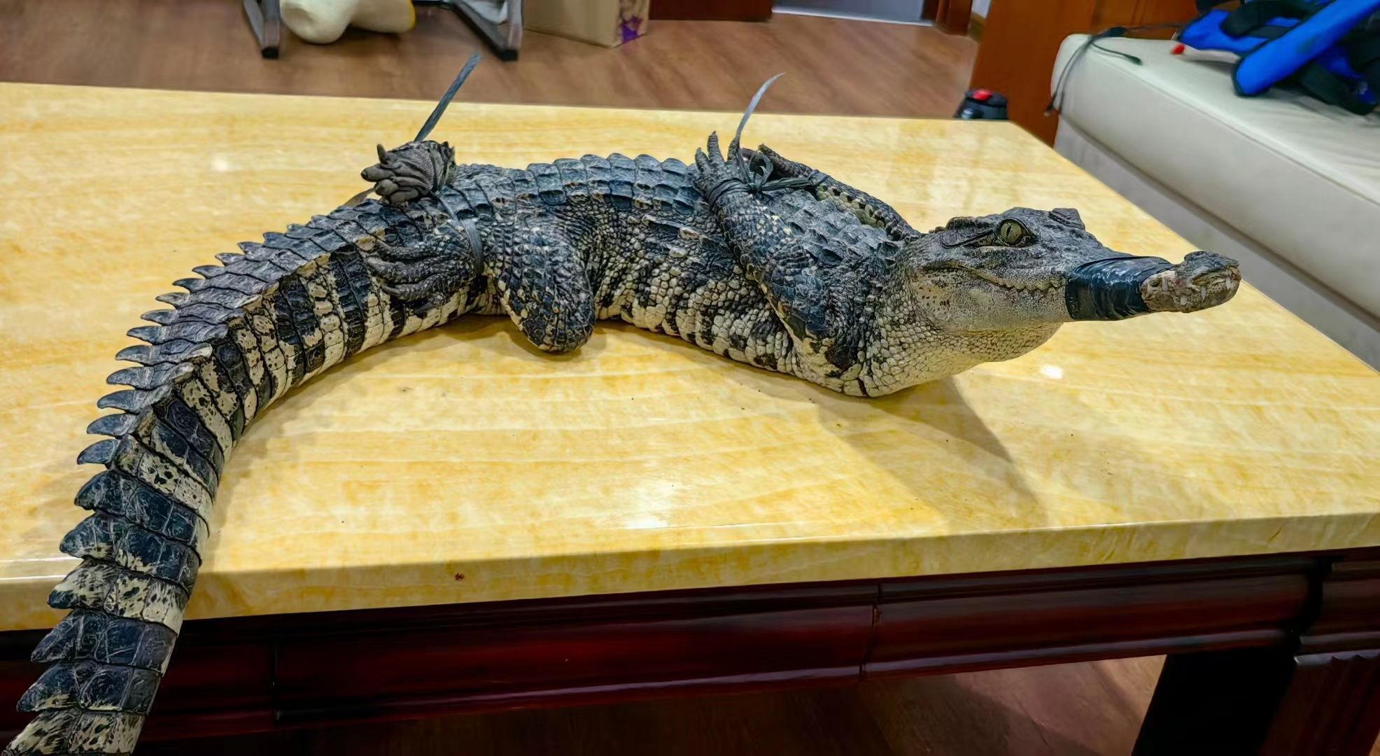经鉴定,这条暹罗鳄约为一岁半,雄性,幼体。测得其体长1.3米,体重13斤。