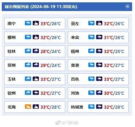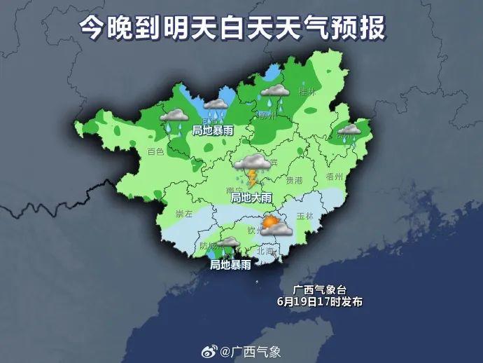 广西壮族自治区气象局也表示,19日晚至20日白天,桂林、柳州、河池、贺州、防城港等市有中到大雨、局地暴雨,其它地区有阵雨或雷雨、局地大雨。20日晚上到21日白天,桂北有中雨、局地大雨到暴雨,桂南多云有阵雨或雷雨、局地大雨到暴雨。21日晚上到22日白天,桂西北有中到大雨、局地暴雨,其它地区多云有阵雨或雷雨、局地大雨到暴雨。