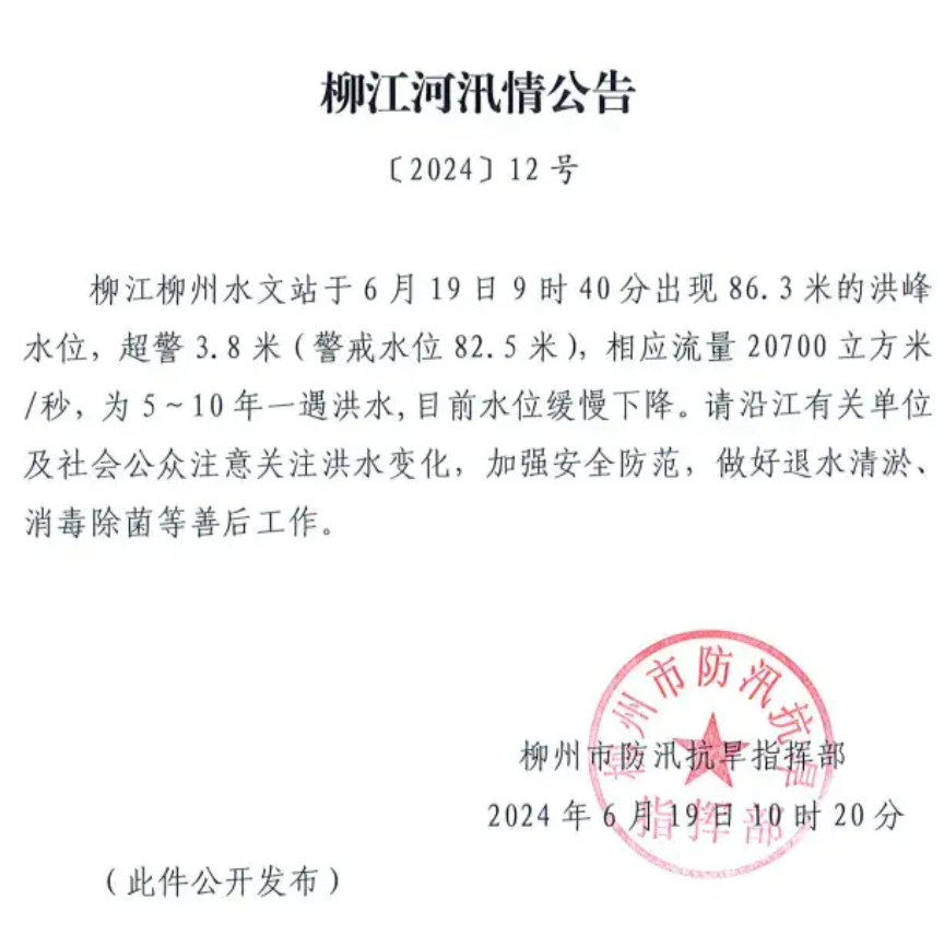 柳州水文中心发布洪峰信息:柳江柳州水位站于6月19日9时40分出现洪峰水位86.3米,超警戒水位(82.5米)3.8米,相应流量20700立方米每秒,为5年~10年一遇洪水。